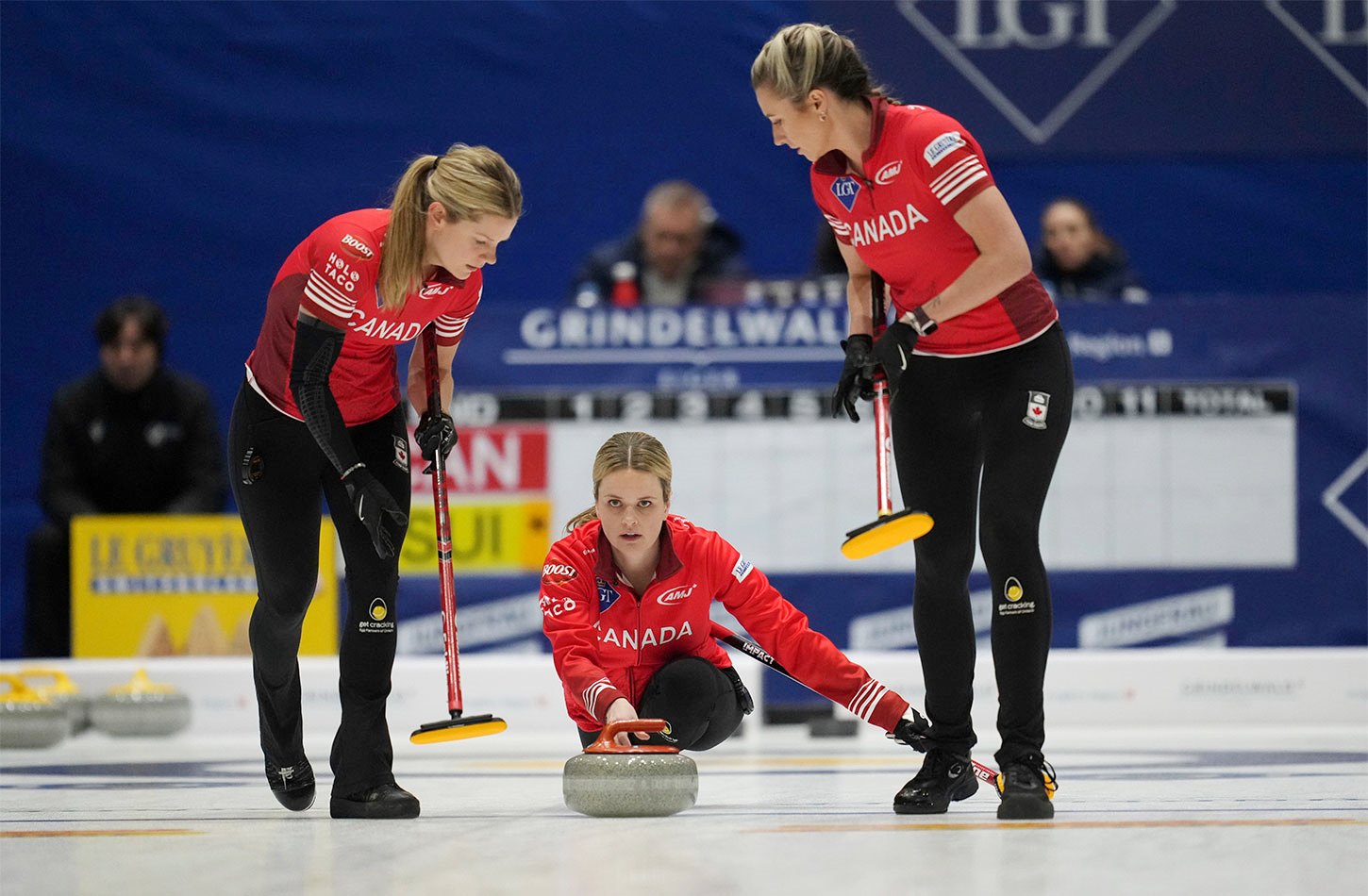 Η skip του Καναδά, Rachel Homan, δίνει εντολές στις συμπαίκτριές της πώς να σκουπίσουν τον πάγο, μετά τη βολή της, στον ημιτελικό με την ομάδα της Νότιας Κορέας στο περσινό Παγκόσμιο Πρωτάθλημα curling (22/3/2025). © AP Photo/Lee Jin-man