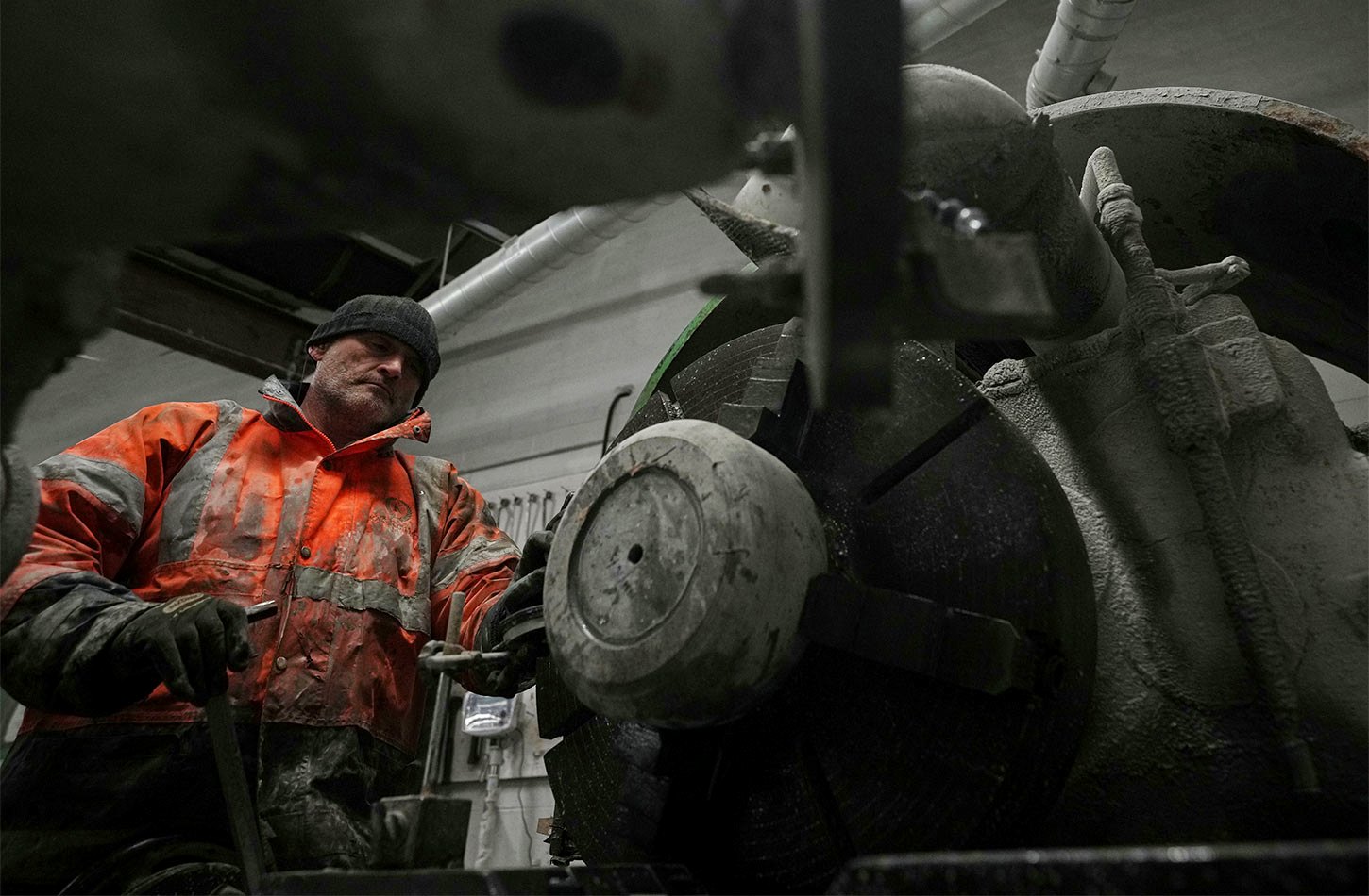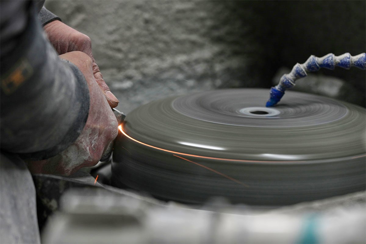 Ένας τεχνίτης κατεργάζεται τον γρανίτη για να τον μετατρέψει σε πέτρα curling, στο εργοστάσιο πέτρας Kays Curling, στο Mauchline της Σκωτίας (11/11/2025). © AP Photo/Alastair Grant