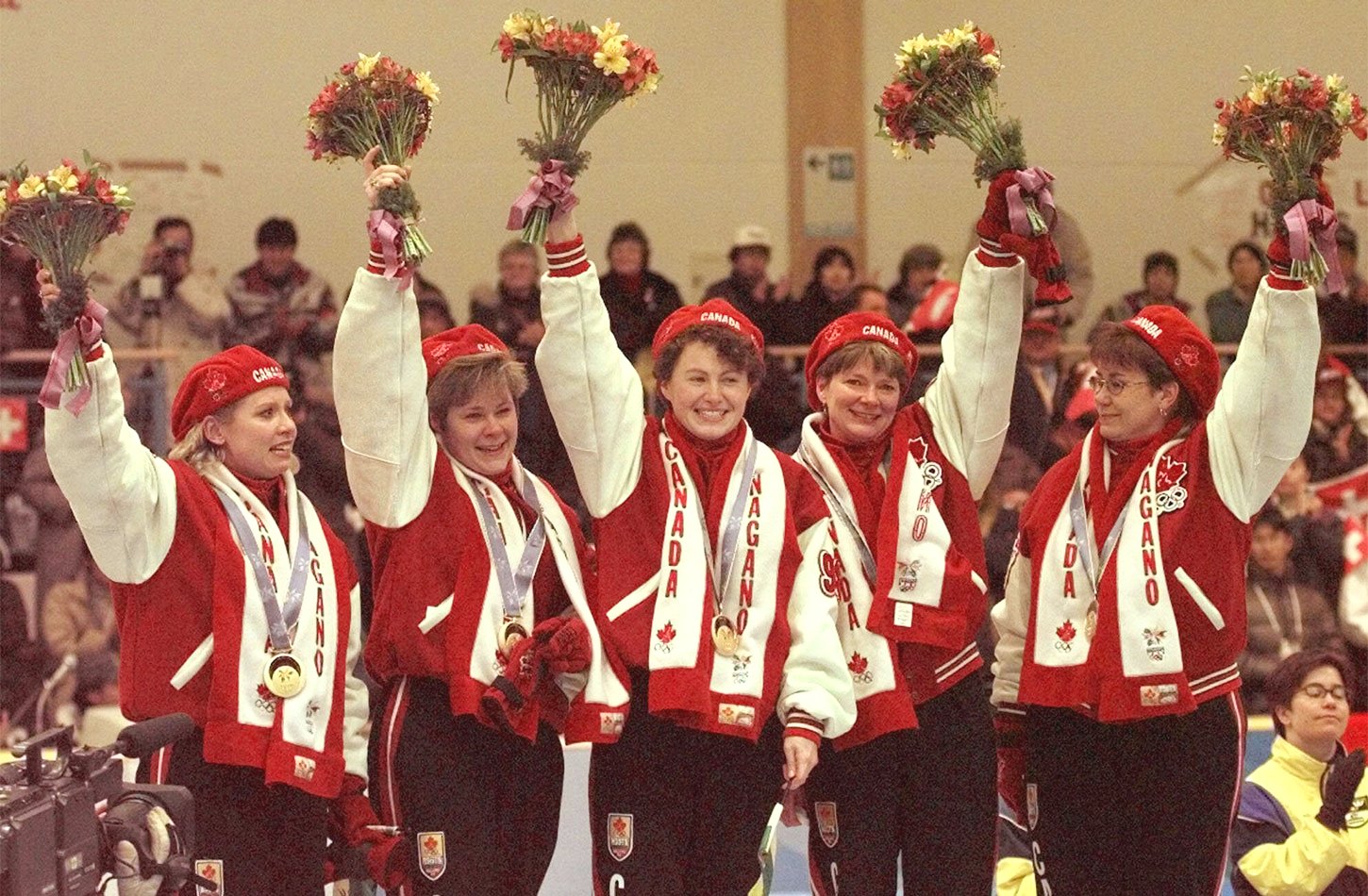 Τα μέλη της γυναικείας ομάδας curling του Καναδά, που κατέκτησαν το χρυσό μετάλλιο στους Χειμερινούς Ολυμπιακούς Αγώνες του 1998 στο Ναγκάνο της Ιαπωνίας, στην πρώτη επιστροφή του curling ως επίσημου Ολυμπιακού αθλήματος μετά το 1924. Από αριστερά, Atina Ford, Marcia Gudereit, Joan McCusker, Jan Betker και Sandra Schmirler (15/2/1998). © AP Photo/Robert F. Bukaty