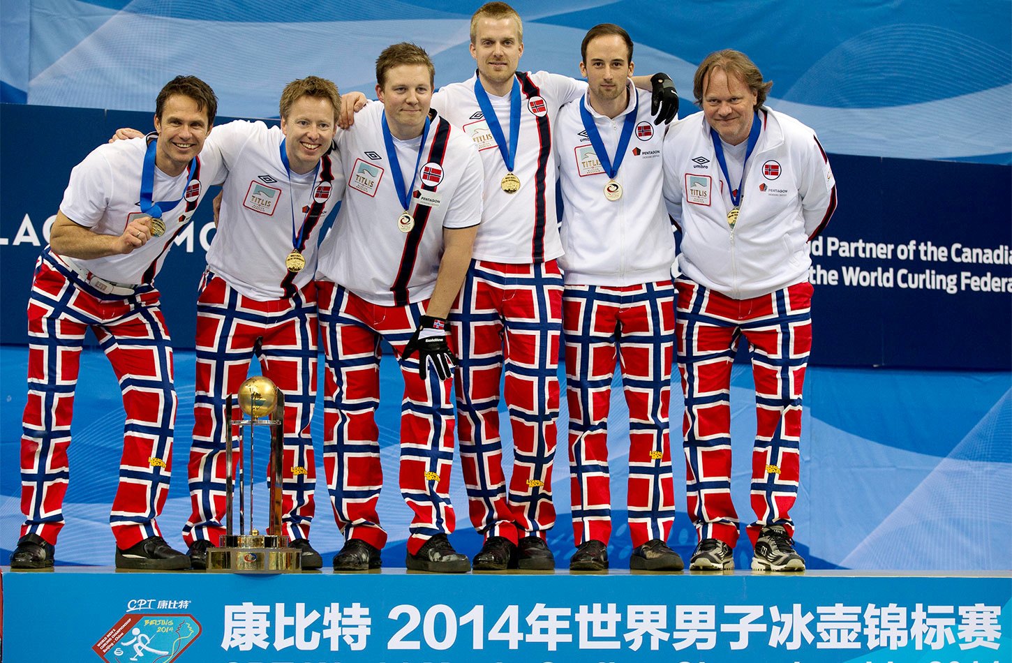 Οι Νορβηγοί ξεχώριζαν ανέκαθεν στο curling για τις ενδυματολογικές τους επιλογές, που πάντα δίνουν ένα ιδιαίτερο χρώμα στις μεγάλες διοργανώσεις. Εδώ βλέπουμε την ομάδα των ανδρών μετά την κατάκτηση του χρυσού μεταλλίου στο Παγκόσμιο Πρωτάθλημα του 2014 στο Πεκίνο της Κίνας (6/4/2014). © AP Photo/Andy Wong