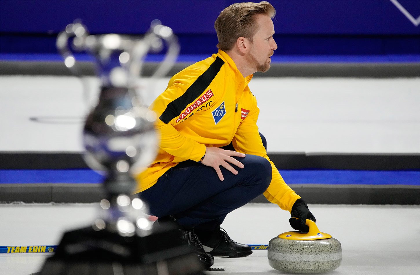 Ο skip (αρχηγός) της σουηδικής ομάδας, Niklas Edin, έτοιμος για μια από τις βολές του στη διάρκεια του τελικού του Παγκοσμίου Πρωταθλήματος του 2022 στο Λας Βέγκας των ΗΠΑ. Σε πρώτο πλάνο το τρόπαιο του Παγκόσμιου πρωταθλητή. Οι Σουηδοί επικράτησαν των Καναδών και κατέκτησαν το χρυσό μετάλλιο και τον παγκόσμιο τίτλο (10/4/2022). © AP Photo/John Locher