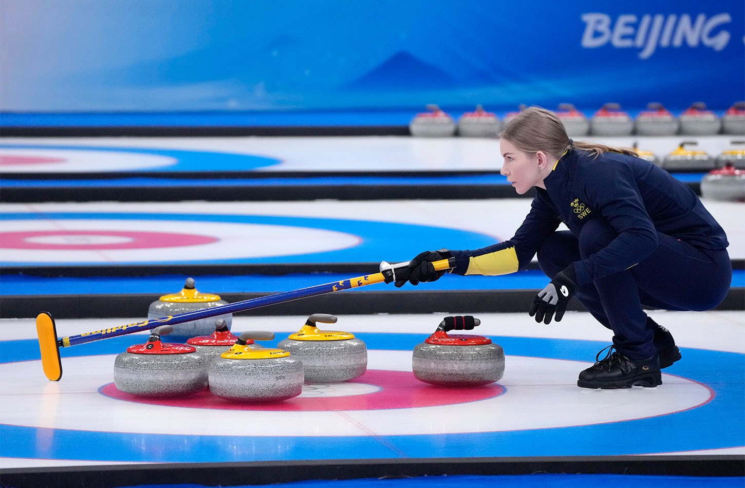 Πολλές πέτρες και των δυο ομάδων συγκεντρωμένες μέσα στο «σπίτι», ενώ η αρχηγός της σουηδικής ομάδας, Almida de Val, δείχνει στη συμπαίκτριά της με τη σκούπα πού ακριβώς να στείλει την επόμενη βολή της (8/2/2022). © AP Photo/Nariman El-Mofty