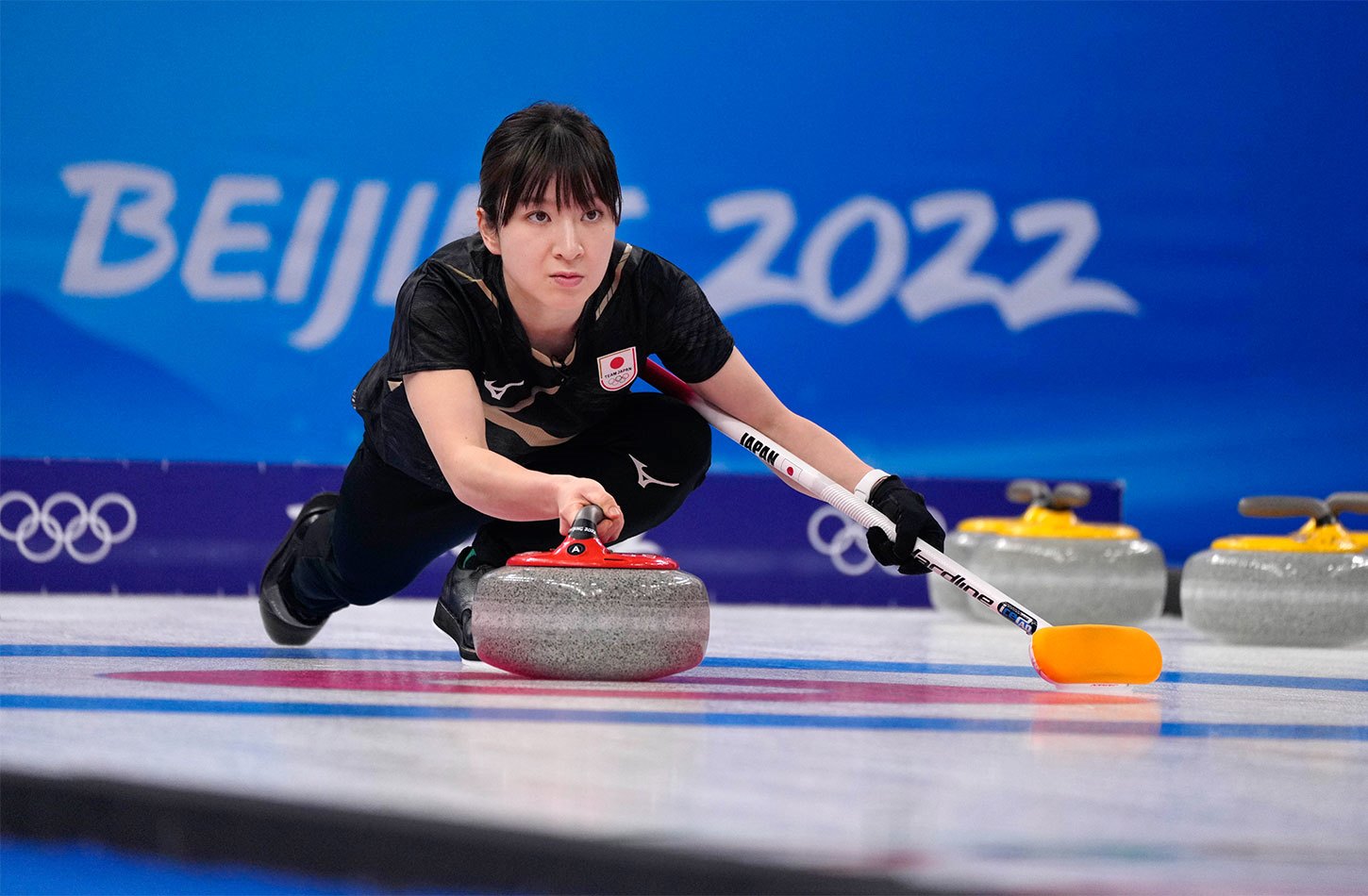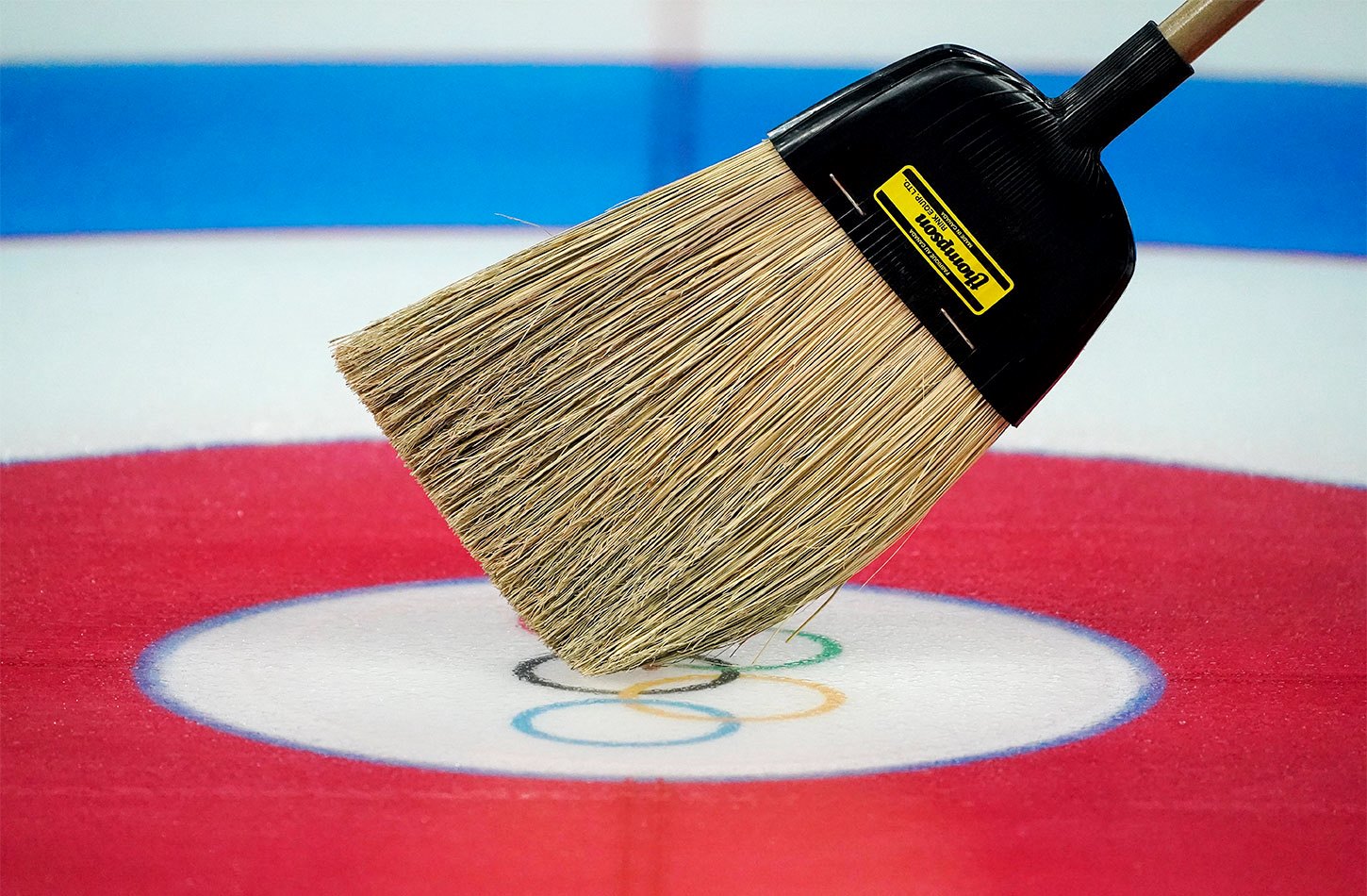Η βούρτσα στο curling χρησιμοποιείται και ως βοήθημα ισορροπίας στον παίκτη ή την παίκτρια που εκτελεί μια βολή. Εδώ η Γιαπωνέζα Yumi Suzuki στη διάρκεια των Χειμερινών Ολυμπιακών Αγώνων του 2022 στο Πεκίνο της Κίνας. © AP Photo/Nariman El-Mofty