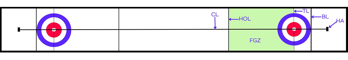 Γράφημα του αγωνιστικού χώρου του curling. CL: Centre line / HOL: Hog line / TL: Tee line / BL: Back line / HA: Hack / FGZ: Free guard zone. Ό,τι ισχύει για τη δεξιά μεριά του γραφήματος, ισχύει και για την αριστερή. © OneMan