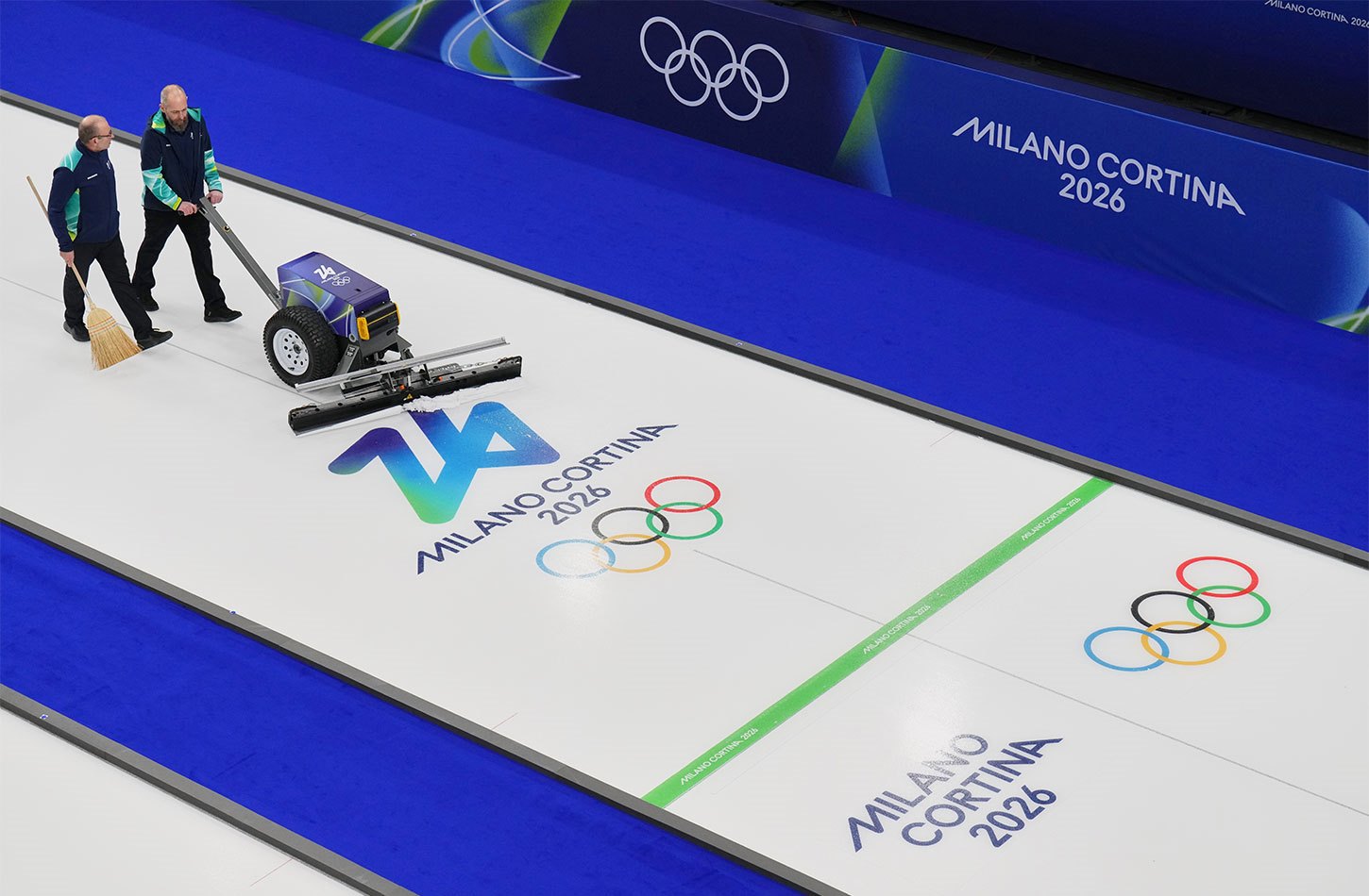 Η προετοιμασία του αγωνιστικού χώρου πριν από τους αγώνες curling στους φετινούς Χειμερινούς Ολυμπιακούς Αγώνες, που θα διεξαχθούν στο Stadio Olimpico del Ghiaccio στην Cortina d'Ampezzo. © AP Photo/David J. Phillip