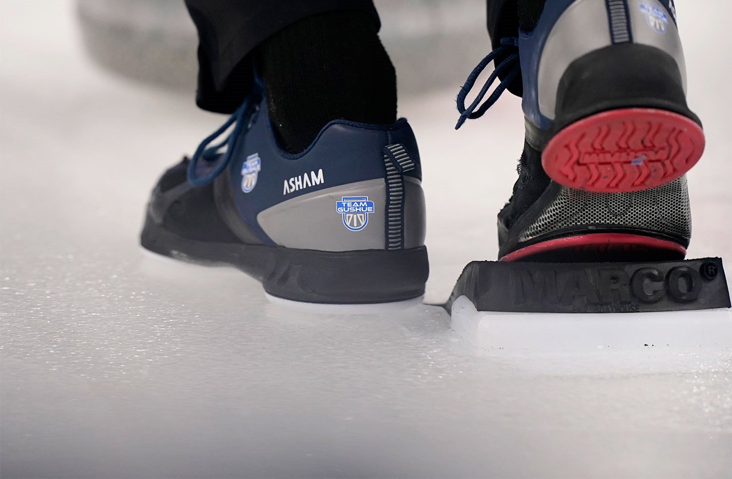 Παπούτσια curling παίκτη του Καναδά, στη διάρκεια των Χειμερινών Ολυμπιακών Αγώνων του 2022 στο Πεκίνο της Κίνας. Το δεξί παπούτσι (gripper) ακουμπάει στο hack, με τον παίκτη να είναι έτοιμος να εκκινήσει για την προσπάθειά του. © AP Photo/Brynn Anderson