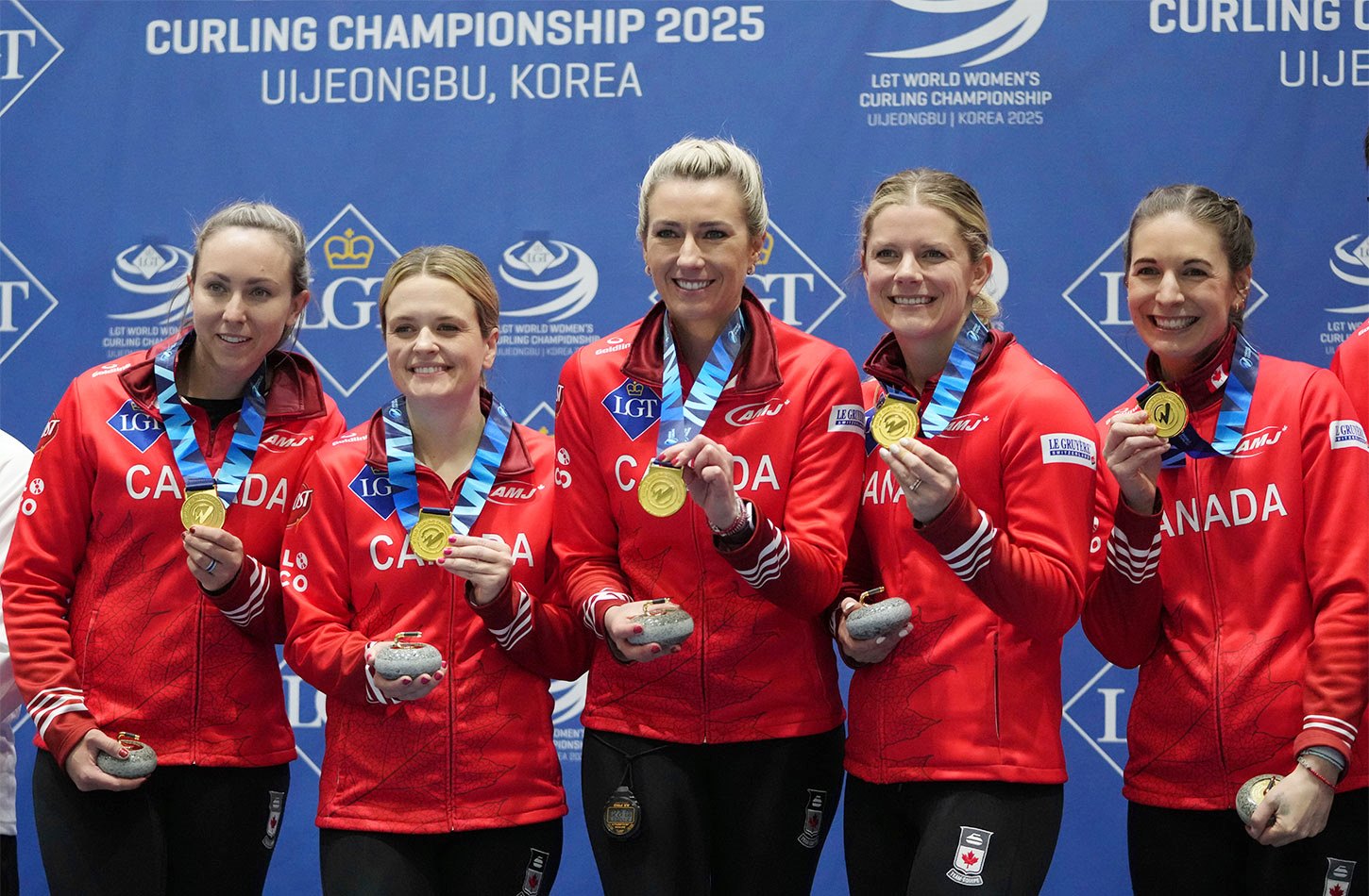 Η ομάδα του Καναδά (οι τέσσερις βασικές αθλήτριες μαζί με την αναπληρωματική) ποζάρει με το χρυσό μετάλλιο που κατέκτησε στο περσινό Παγκόσμιο Πρωτάθλημα στη Νότια Κορέα (23/3/2025). © AP Photo/Lee Jin-man