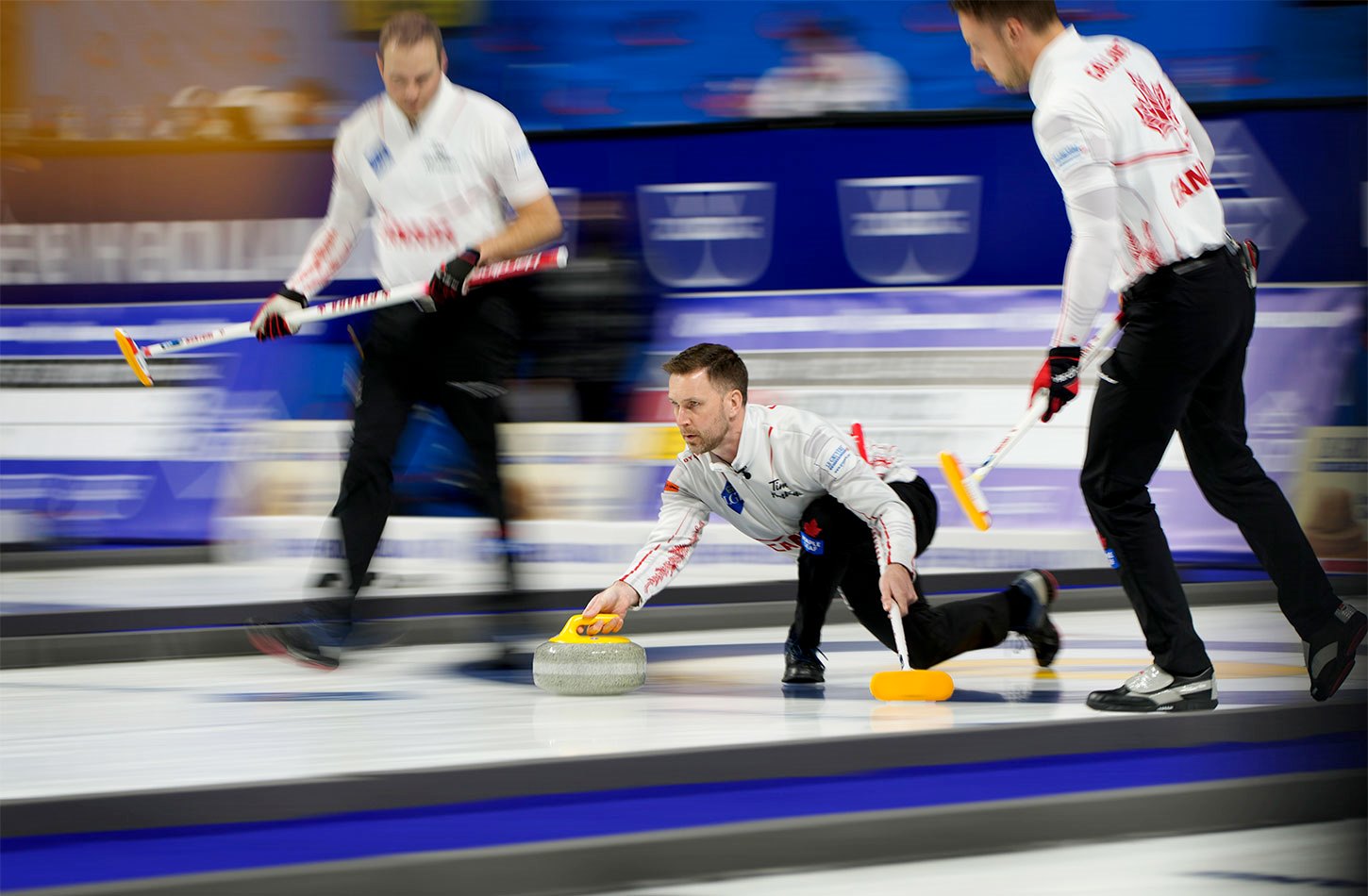 Ο Brad Gushue, skip της καναδικής ομάδας, ετοιμάζεται να αφήσει μια πέτρα, ενώ οι δυο sweepers παρακολουθούν, έτοιμοι να ξεκινήσουν το σκούπισμα, στη διάρκεια αγώνα του Καναδά με τη Γερμανία, στο Παγκόσμιο Πρωτάθλημα του 2022 στο Λας Βέγκας των ΗΠΑ. © AP Photo/John Locher