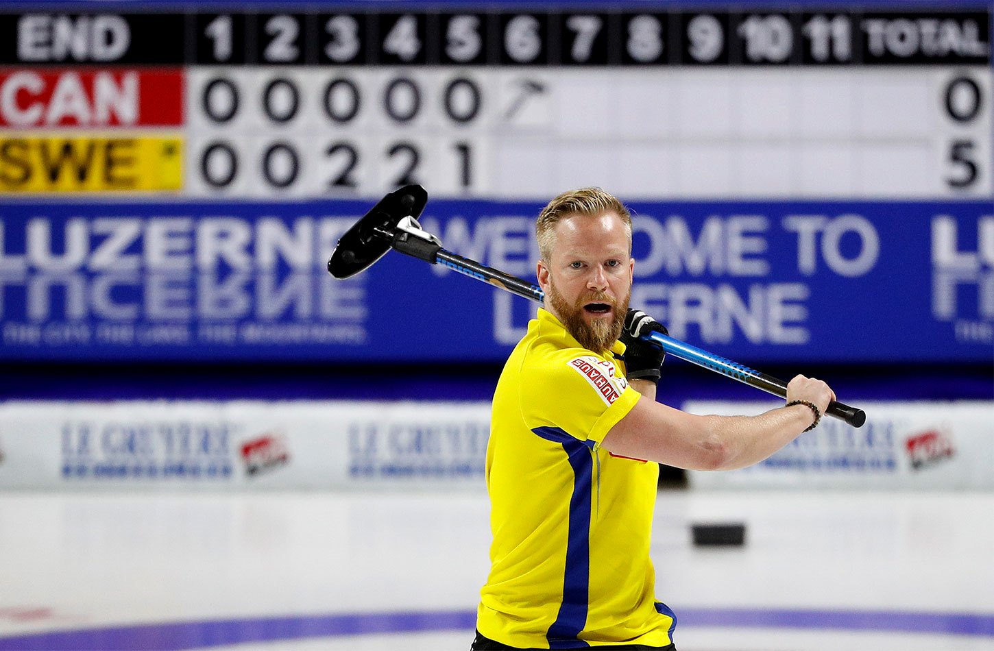 Ο skip της Σουηδίας, Niklas Edin, στη διάρκεια του τελικού του Παγκόσμιου Πρωταθλήματος του 2018 στο Λας Βέγκας των ΗΠΑ. Στο βάθος βλέπετε τον ηλεκτρονικό πίνακα του σκορ και κάτω από τον αριθμό 6 (που σημαίνει ότι παίζεται το έκτο end) διακρίνεται το σφυρί (hammer) που υποδηλώνει ότι σε αυτό το end, ο Καναδάς έχει το πλεονέκτημα της τελευταίας πέτρας. © AP Photo/John Locher