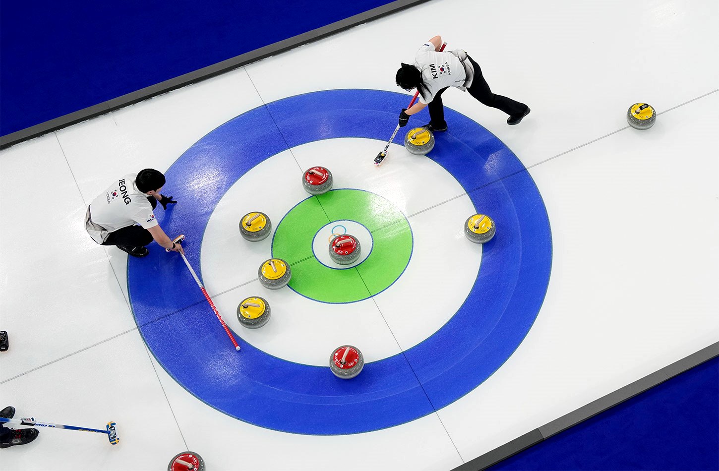 Παιχνίδι ενός πόντου (η κόκκινη πέτρα μέσα στο κουμπί) σε αγώνα mixed doubles ανάμεσα στη Νότια Κορέα και τη Σουηδία στους φετινούς Χειμερινούς Ολυμπιακούς Αγώνες (4/2/2026). © AP Photo/David J. Phillip