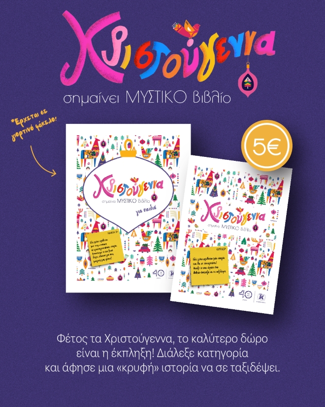 ΔΕΝ ΞΕΡΕΙΣ ΤΙΠΟΤΑ ΓΙΑ ΑΥΤΟΝ/ΗΝ; ΜΗ ΣΚΑΣ! Άφησε την τύχη να δουλέψει για σένα! Με μόλις 5€ στο e-shop των εκδόσεων Κλειδάριθμος ή στο pop-up βιβλιοπωλείο των Εκδόσεων στη Δημοτική αγορά Κυψέλης έως τις 19 Δεκεμβρίου, θα βρεις μερικά βιβλία-έκπληξη. Διαλέγεις το είδος και παίρνεις ένα δώρο σε γιορτινό περιτύλιγμα!