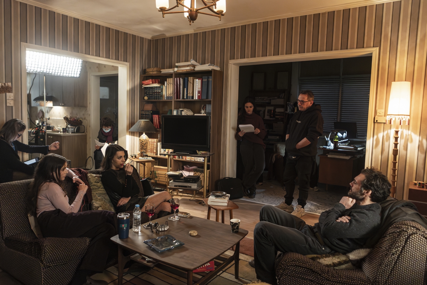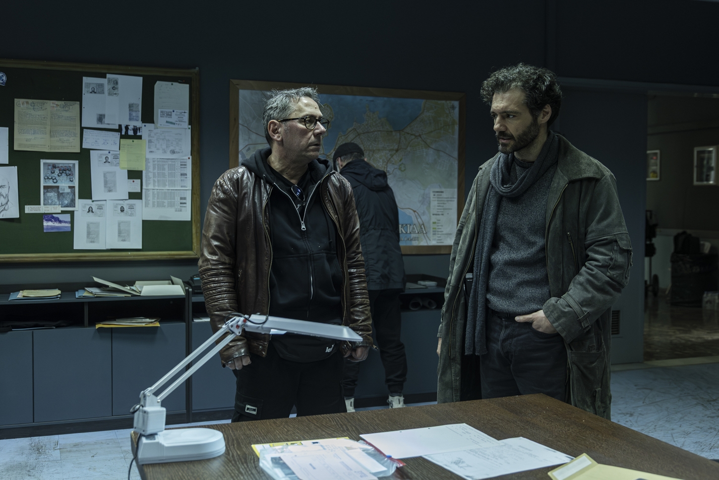 Ο παραγωγός της σειράς Διονύσης Σαμιώτης που μας ξεναγεί στον χώρο πριν αρχίσουμε να παρακολουθούμε το γύρισμα της ημέρας σε έναν άλλο χώρο, του τρίτου ορόφου, όπου έχει διαμορφωθεί ως το γραφείο του Καπετάνου στο αστυνομικό τμήμα Χαλκίδας, μου δείχνει φωτογραφίες από ένα γύρισμα προηγούμενων ημερών. Σε αυτές, ο χώρος φιλοξενεί στρατιωτικά αμάξια των ‘70s και ένα κρυφό σχολειό.