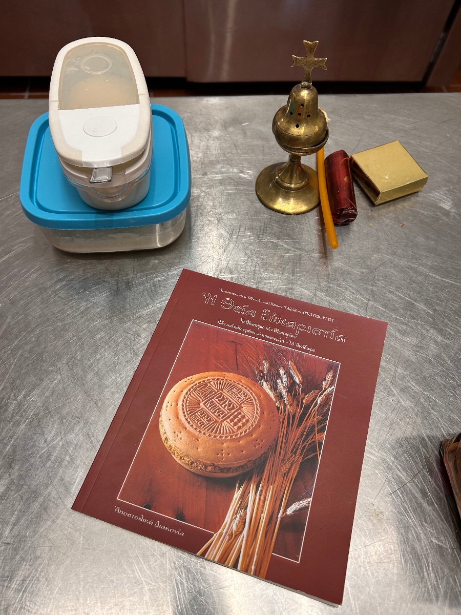 Η κυρία Πόλα τακτοποιεί τα σκεύη και στήνει στον πάγκο της κουζίνας όσα χρειάζεται: ένα κεράκι, το θυμιατό με το καρβουνάκι και τα τρία λιβάνια, το χαρτί της προσευχής. Η προετοιμασία για το πρόσφορο είναι πρωτίστως πνευματική, θα μας πει πριν ξεκινήσει.