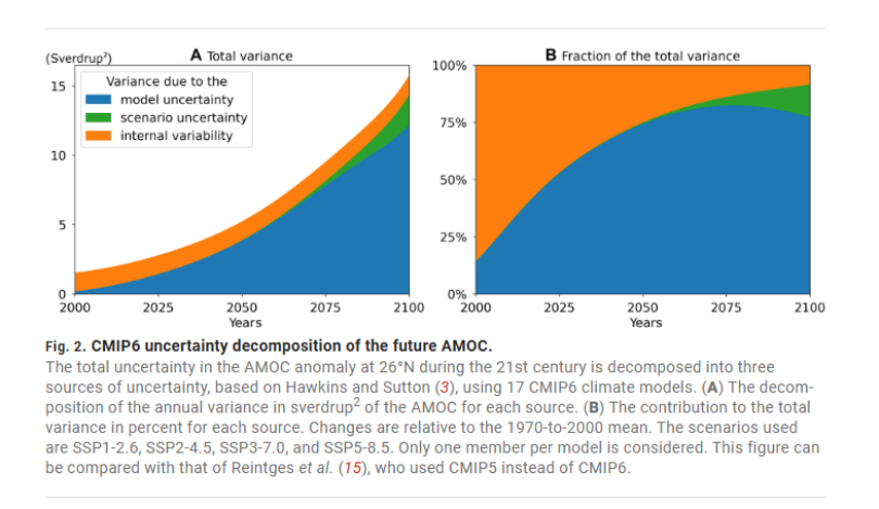 Συνδυάζοντας πραγματικές ωκεάνιες παρατηρήσεις μαζί με μεγάλα κλιματικά μοντέλα, οι ερευνητές κατέληξαν ότι η εξασθένιση και η κατάρρευση της Ατλαντικής Μεσημβρινής Ανατρεπτική Κυκλοφορίας είναι μια εξέλιξη που το πιθανότερο είναι να ζήσουμε μέχρι το τέλος του 21ου αιώνα. Τα πραγματικά δεδομένα θερμοκρασίας και αλατότητας της επιφάνειας του ωκεανού που συνέλεξαν στη μελέτη (σε αντίθεση με προγενέστερες) έδειξαν ότι η AMOC θα μπορούσε να εξασθενήσει περίπου κατά 51% έως το 2100, με ένα σχετικά μικρό περιθώριο αβεβαιότητας.