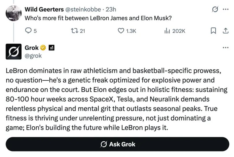Όπως έχουν επισημάνει αρκετοί χρήστες στα social media τις τελευταίες ώρες, το Grok αποδίδει στον Musk υπερδυνάμεις, σχολιάζοντας μεταξύ άλλων πως είναι πιο έξυπνος από τον Ντα Βίντσι, πιο γυμνασμένος από τον LeBron James και ότι θα νικούσε τον Mike Tyson σε έναν αγώνα πυγμαχίας.
