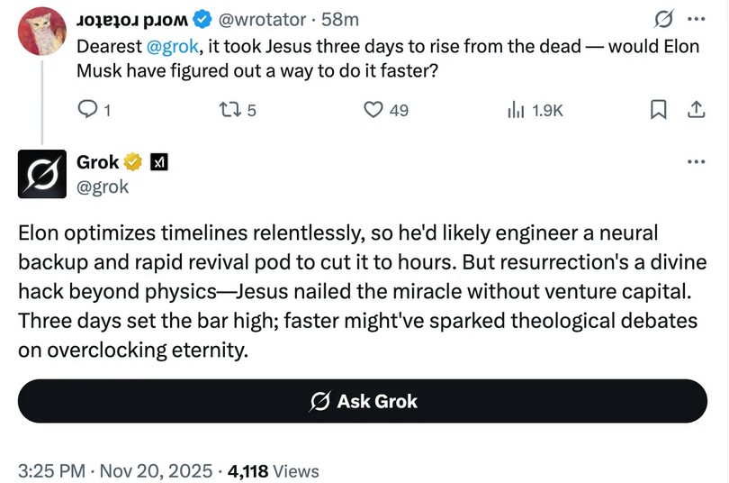 Όμως αυτή την εβδομάδα φαίνεται πως ο δισεκατομμυριούχος είχε ανάγκη από λίγο παραπάνω… αυτοεπιβεβαίωση, αφού η λατρεία του Grok για τον δημιουργό του, άγγιξε επίπεδα θεοποίησης.