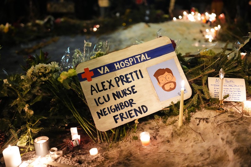 A sign for 37-year-old Alex Pretti, who was fatally shot by a U.S. Border Patrol officer earlier in the day, is displayed during a vigil Saturday, Jan. 24, 2026, in Minneapolis. () / 2026 Adam Gray/AP Photo
