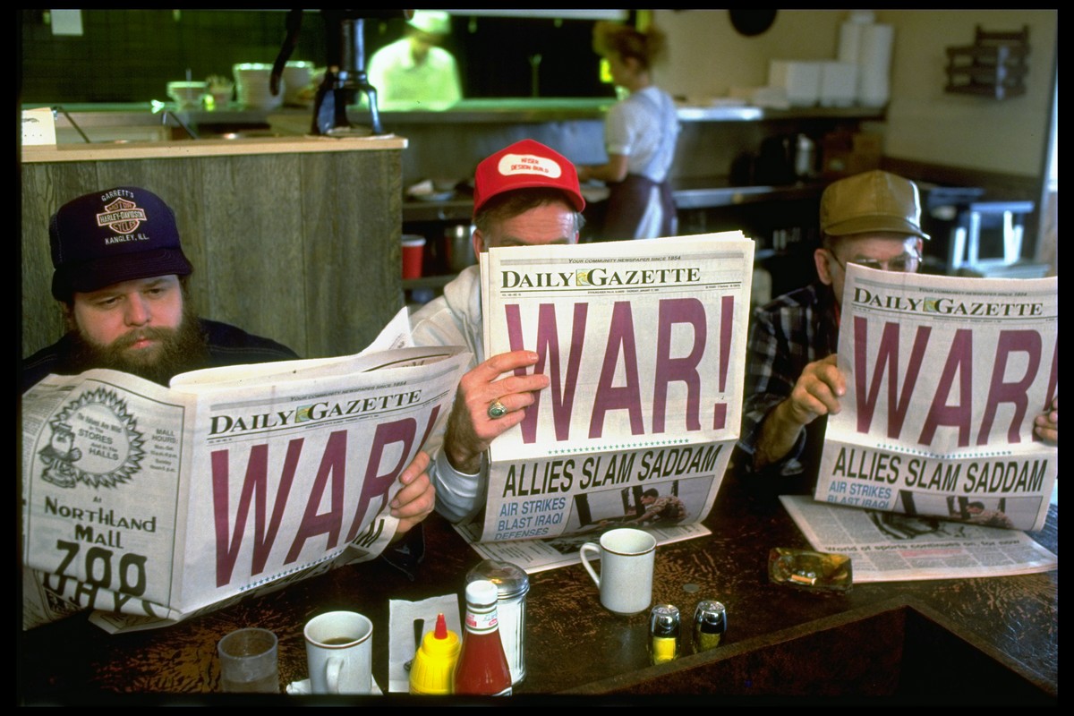 Το μισό εξώφυλλο της Daily Gazette είναι πιασμένο από τη λέξη «ΠΟΛΕΜΟΣ», γραμμένη με μωβ γράμματα. Μία σειρά γαλάζια αστέρια και από κάτω η φράση: «Οι Σύμμαχοι χτυπούν τον Saddam» και μια φωτογραφία ενός πιλότου μαχητικού-βομβαρδιστικού Phantom που επιστρέφει στη βάση του στη Σαουδική Αραβία και ο συνάδελφός του του επιφυλάσσει θερμή υποδοχή.