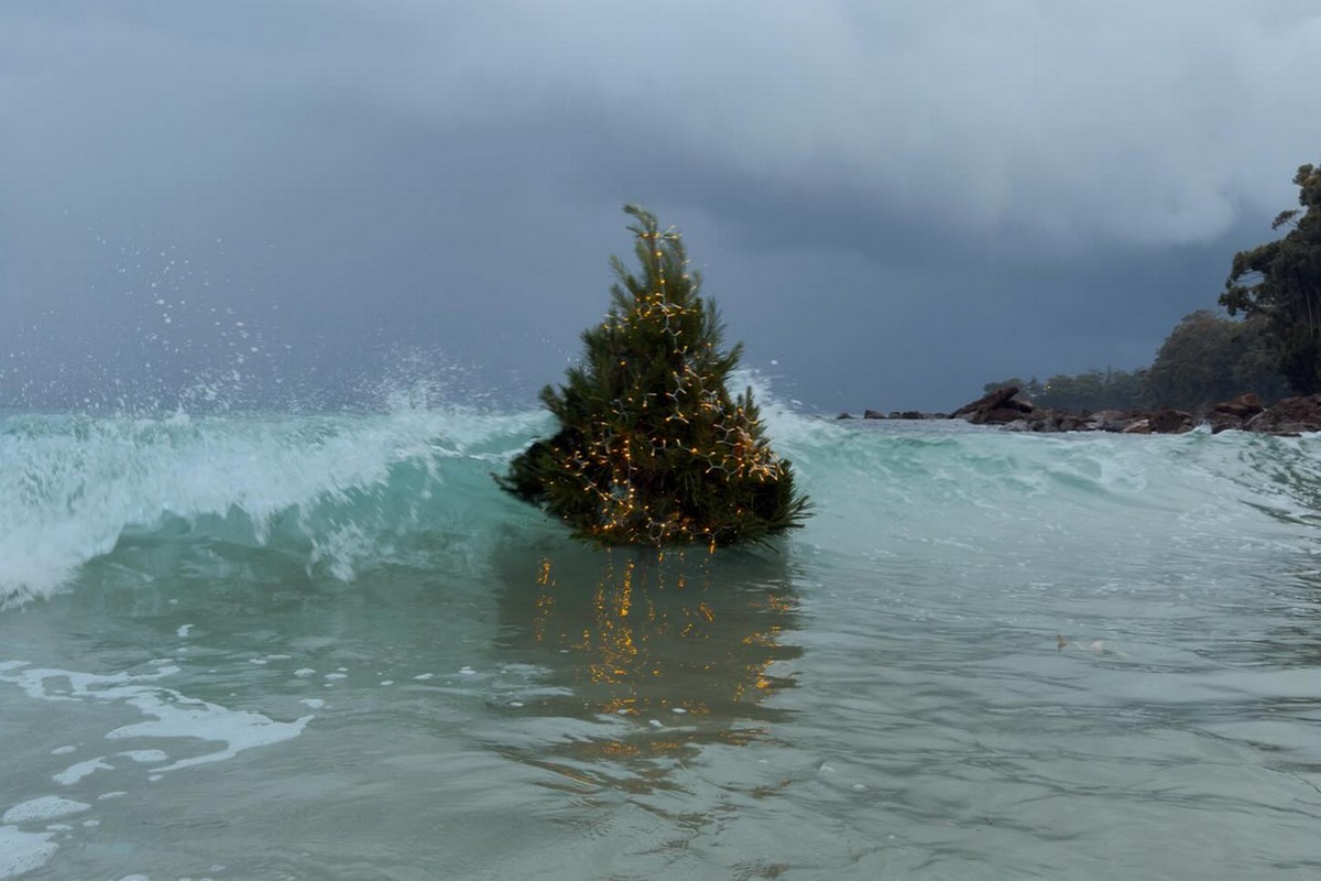 Ένα χριστουγεννιάτικο δέντρο, στολισμένο με λαμπάκια, στέκεται στη μέση της θάλασσας, ενώ κύματα περνούν γύρω του.