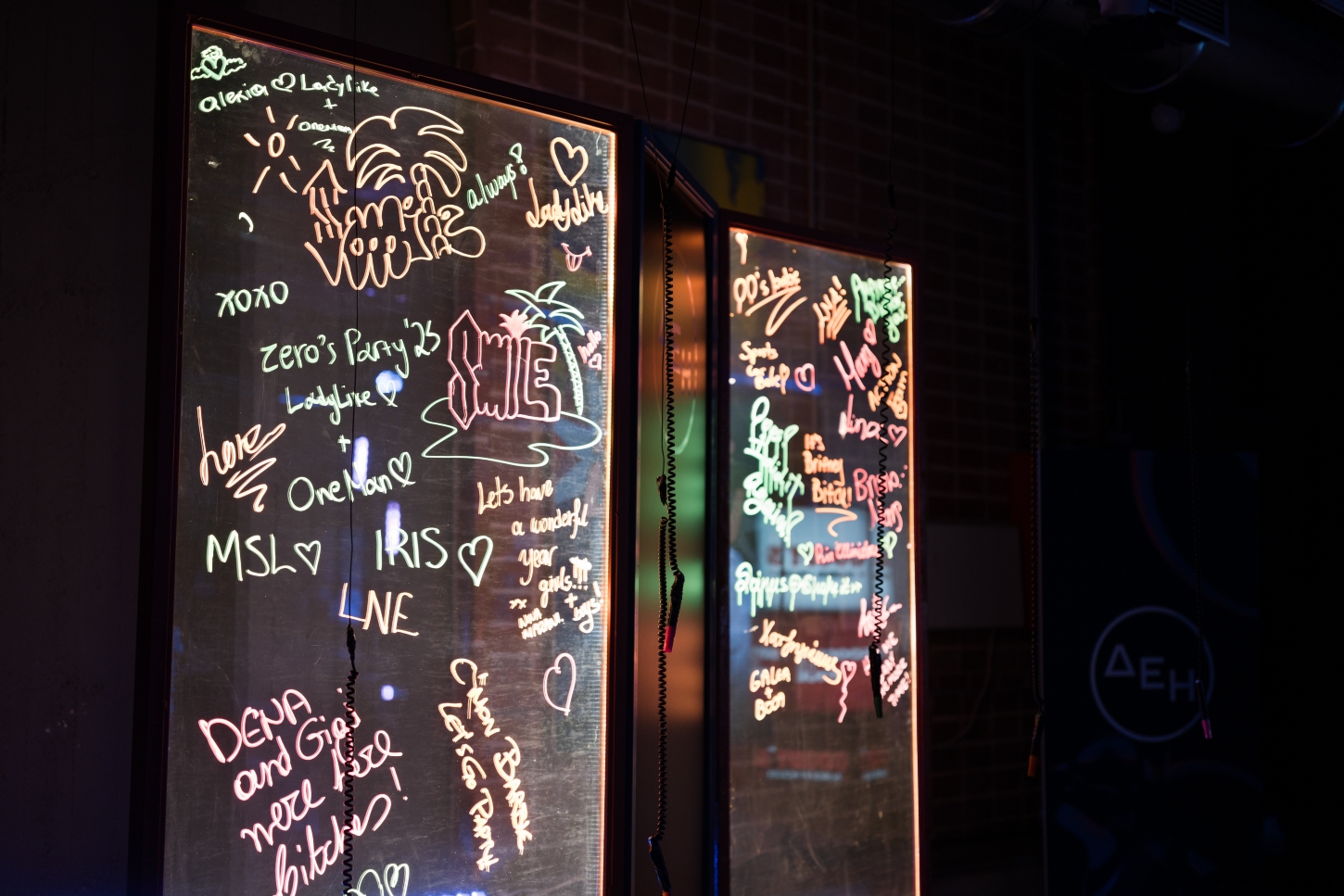Δίπλα ακριβώς από τον χώρο που χορεύαμε, η ΔΕΗ θέλησε να μας θυμίσει τι σημαίνουν για τον καθένα από εμάς τα 00s. Μήπως η Britney Spears “bitch” ή η Rihanna με το “under my umbrella”; Κι αν σημαίνουν τα καρφάκια-φράχτης, τα τζην σορτς με το μαύρο καλσόν ή το Smile σχέδιο που ζωγραφίζαμε στα σχολικά τετράδια (if you know, you know); Μία ερώτηση με αμέτρητες πιθανές απαντήσεις, που κάθε καλεσμένος του party έδωσε ζωγραφίζοντας με neon μαρκαδόρους στο πρωτοποριακό installation της ΔΕΗ, το Neon Signature Wall.