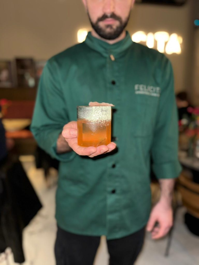 Στο Felicità στο Ρουφ, ο Μάριος Ηλιόπουλος παίρνει το Penicillin και του δίνει μια εντελώς νέα, ανατρεπτική διάσταση. Η συνταγή ξεφεύγει από τα συνηθισμένα, χτίζοντας μια βαθιά, στιβαρή βάση όπου το Glenlivet Caribbean Reserve συναντά το ιρλανδέζικο Two Stacks Single Malt Whiskey. Η μεγάλη γευστική ανατροπή έρχεται με την προσθήκη μπανάνας και Falernum που χαρίζουν τροπική πολυπλοκότητα, ενώ το Fernet Branca βάζει την απαραίτητη βοτανική και γήινη πικράδα. Το ποτό σερβίρεται κομψά σε χαμηλό ποτήρι, με ένα μεγάλο block διάφανου πάγου και μια διακριτική γαρνιτούρα να αναπαύεται στο χείλος του. Μια στιβαρή δημιουργία με βαθύ, χρυσαφένιο χρώμα, που ισορροπεί μαγικά ανάμεσα στο φρουτώδες, το βοτανικό και το ξηρό, φέρνοντας το κλασικό «γιατρικό» στα μέτρα της ιταλικής aperitivo κουλτούρας.