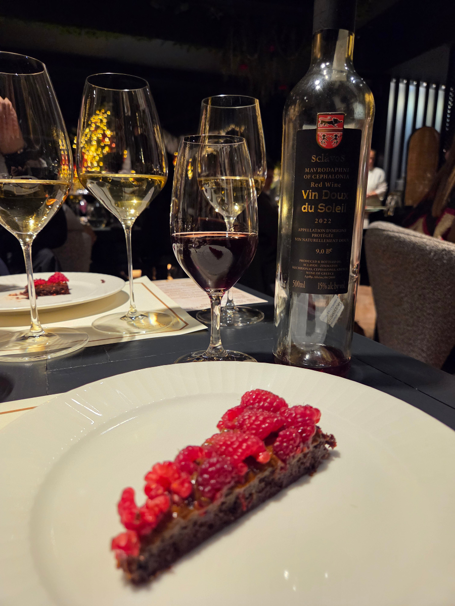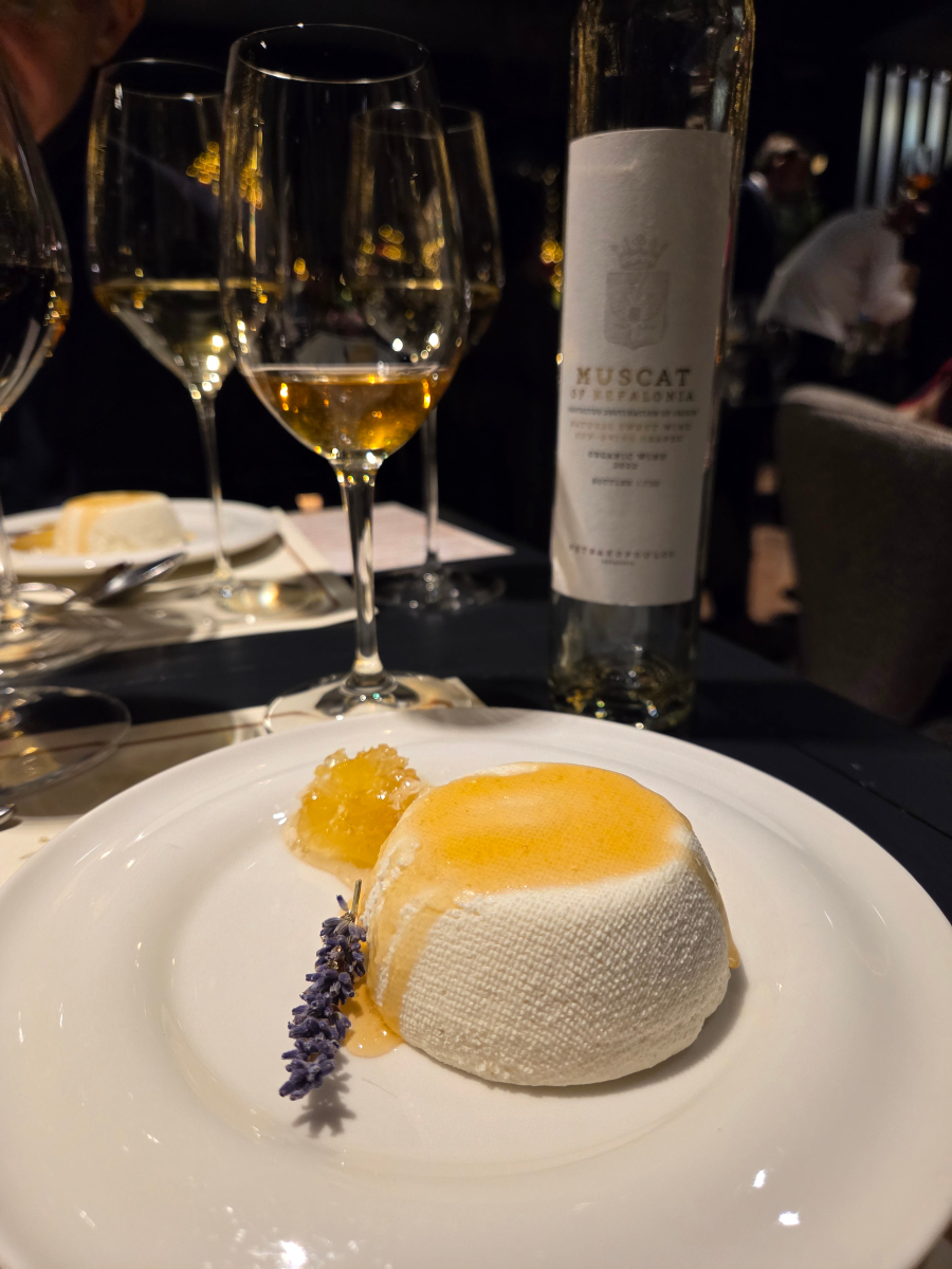 Στη γευσιγνωσία συμμετείχαν οι ετικέτες των οινοποιείων Gentilini Winery, Κτήμα Χαριτάτου, Ορεάλιος Γη, Petrakopoulos Wines, Sarris Wines και Sclavos Wines, με το κάθε κρασί να συνοδεύεται από ένα ξεχωριστό έδεσμα. Τα δικά μου αγαπημένα όμως ήταν δύο. Η μους ξινομυζήθρας με μέλι, κερήθρα και λεβάντα που ήρθε για να συμπληρώσει το Μοσχάτο Πετρακόπουλου και η σοκολατένια αμυγδαλόπιτα με χαρούπι, πάστα αποξηραμένων δαμάσκηνων και σμέουρα, την οποία συνόδευε η γλυκιά Μαυροδάφνη του Σκλάβου.