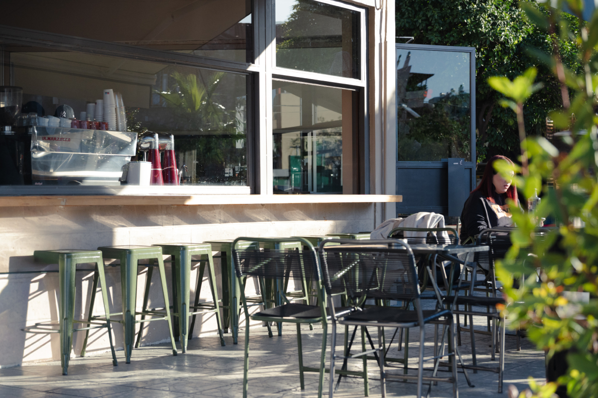 Εδώ ο μεσημεριανός καφές μετατρέπεται εύκολα σε after office drinks αλλά και κοκτέιλ στη μεγάλη μεταλλική μπάρα, που κλέβει τις εντυπώσεις.