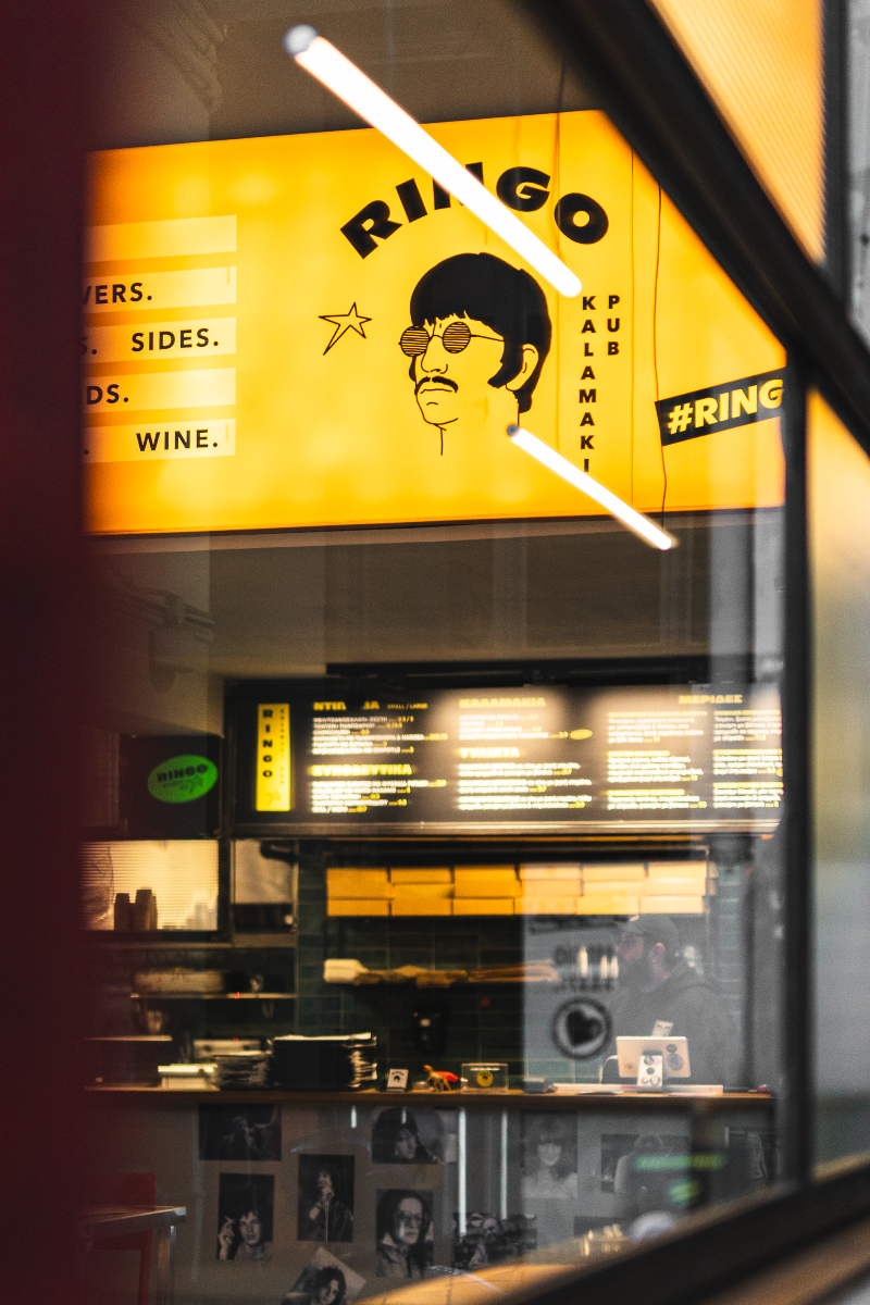 Το Ringo όμως δεν στέκεται μόνο στο φαγητό. Η διακόσμηση μπλέκει ροκ σταρ, ελληνικό σινεμά, βινύλια και αθλητική κουλτούρα. Όλα συνυπάρχουν με έναν παράξενα φυσικό, σουρεαλιστικό τρόπο. Στην οθόνη, που συνήθως παίζει κάποιο live, προβάλλουν αθλητικούς αγώνες και κάπως έτσι η λογική της παμπ δένει απόλυτα με το σουβλάκι και την μπίρα.