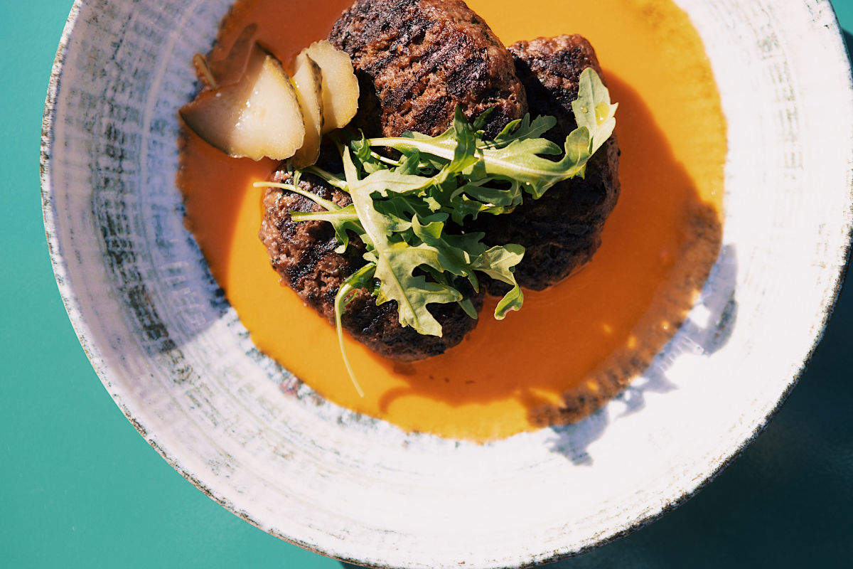 Έτσι, τα μοσχαρίσια κεφτεδάκια συνδυάζονται με μία σάλτσα ντομάτας με φέτα και μπάμιες τουρσί και ο κόκορας με χειροποίητα ζυμαρικά.
