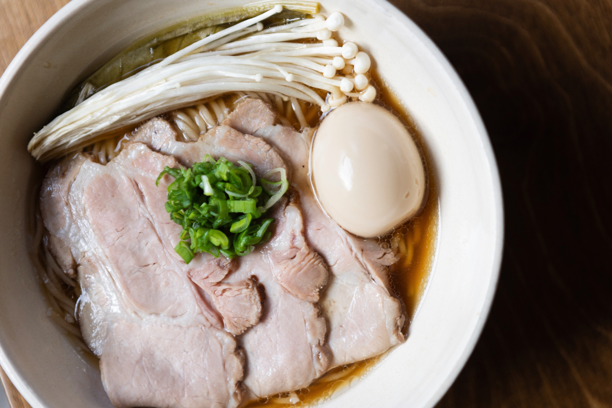 Για ένα χορταστικό ζεστό πιάτο, δοκίμασε το Shoyu Ramen, ένας διαυγής ζωμός κοτόπουλου με soy sauce και dashi, που συνδυάζεται με μανιτάρια enoki, λάπαθο, χοιρινό chashu και αυγό.