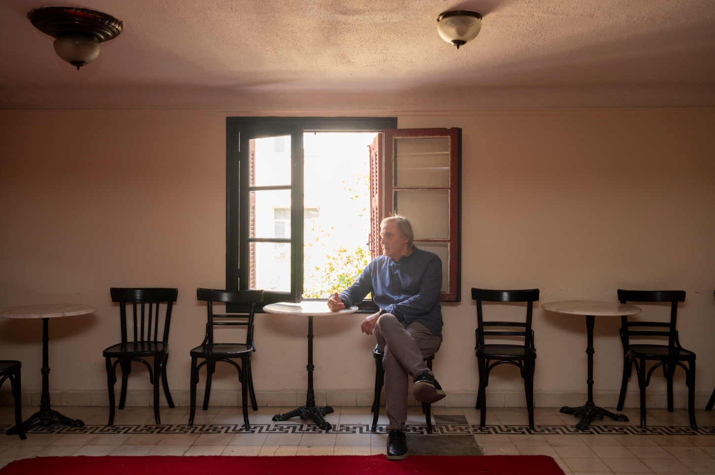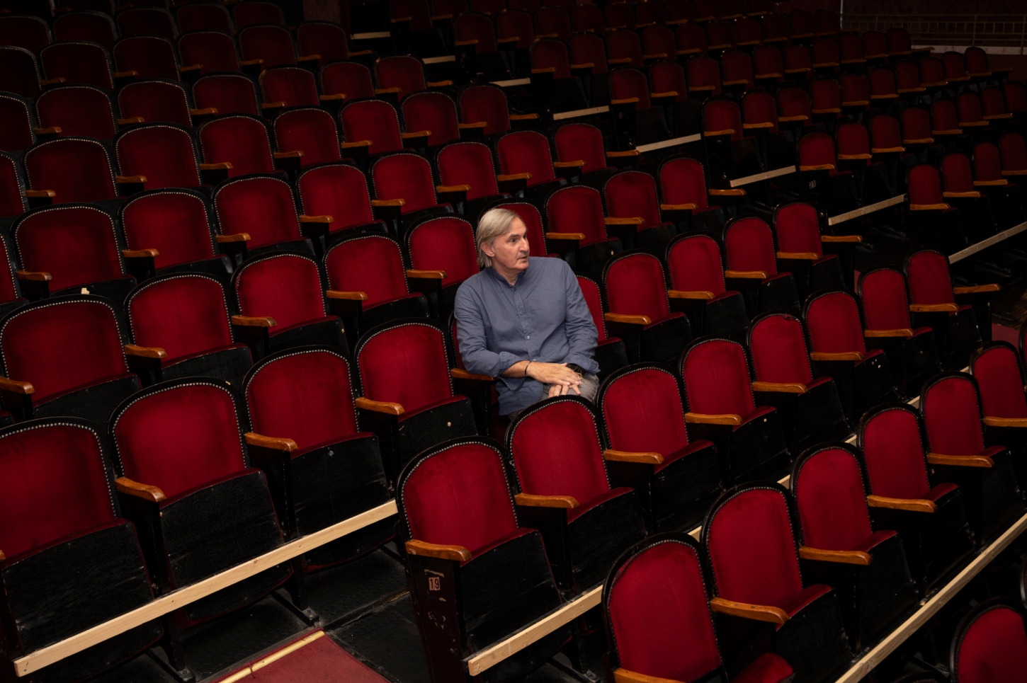 Στο φουαγιέ του Θεάτρου Βρετάνια, το φως που μπαίνει από τα μικρά, ανοιχτά παράθυρα είναι αμυδρό. Είναι τόσο-όσο να δημιουργεί ένα μικροκλίμα δροσιάς. Ο θόρυβος, από την άλλη, είναι έντονος. Είναι μεσημέρι καθημερινής στα μέσα του Σεπτέμβρη, έξω έχει ακόμα καλοκαιρινή ζέστη και η βουή στο κέντρο της πόλης βρίσκεται στο peak της.