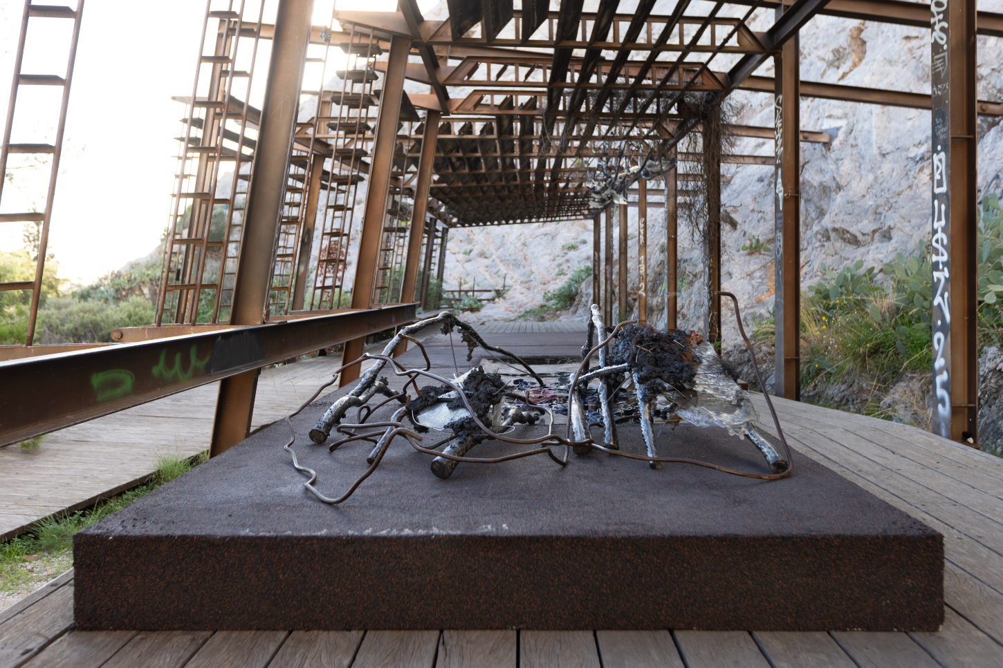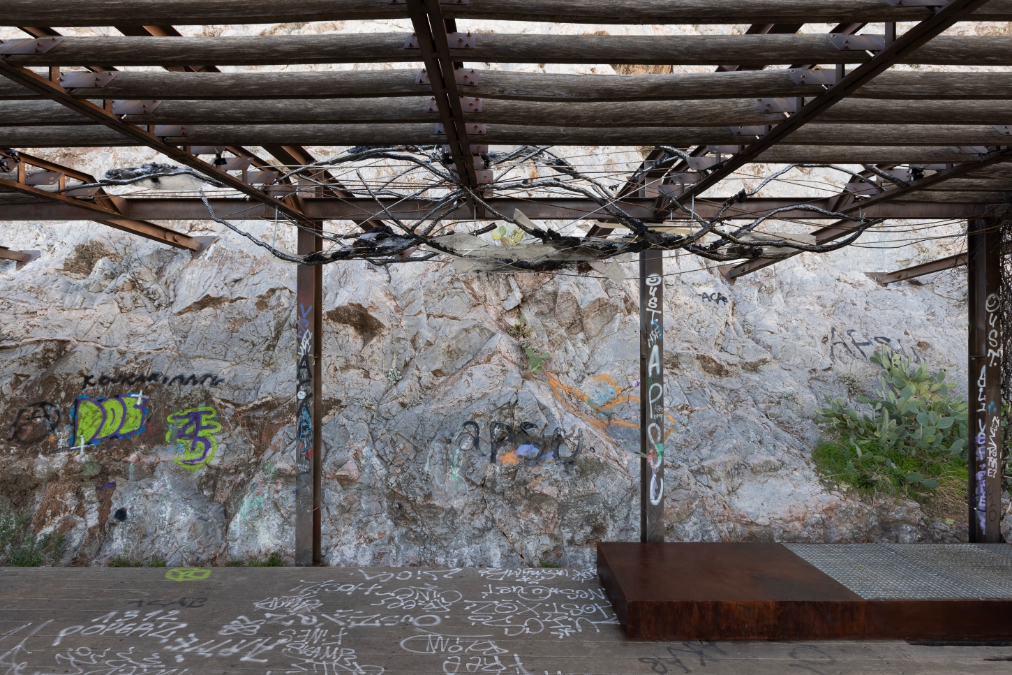 Από την είσοδο στον λόφο Φιλοπάππου πλησίον της συμβολής Παναιτωλίου και Ορλώφ, ακολουθώντας το μονοπάτι που φωτίζουν οι επιδαπέδιοι προβολείς κάτω από την ταμπέλα για τη νέα ανάθεση από το πρόγραμμα Έργο στην Πόλη –μία καθιερωμένη πλέον πρωτοβουλία από τον οργανισμό ΝΕΟΝ που στηρίζει Έλληνες εικαστικούς για έργα σε διάλογο με τον δημόσιο χώρο–, οδηγούμαστε σε ένα ήσυχο πλάτωμα του λόφου, στη σκιά ενός επιβλητικού κατακόρυφου βράχου που τη μορφή του έχουν διαμορφώσει τα καλέμια των λατόμων μέσα στα χρόνια.