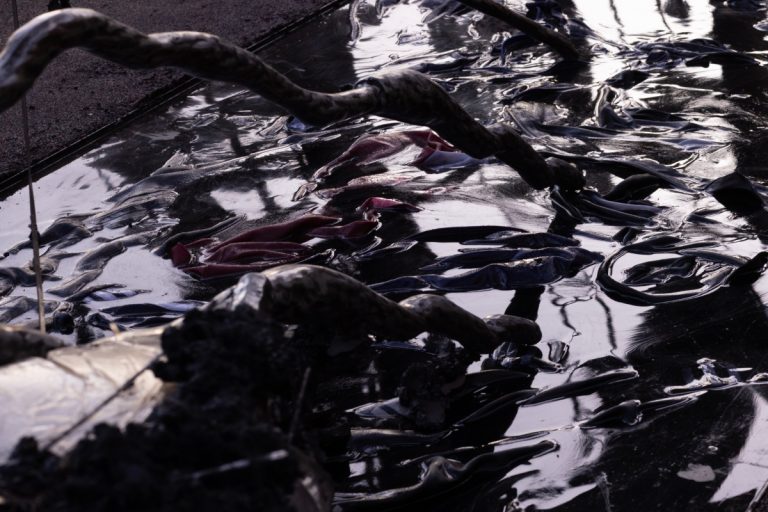 Ρωτάω τον εικαστικό εάν μεταφέρει όντως στο έργο του το τέλος μίας εποχής. «Ακριβώς», απαντάει, «ο τίτλος παραπέμπει στο αίσθημα της ξενέρας που νιώθεις όταν κλείνει η μουσική και σκάει το φως της ανατολής, όταν όλα γύρω σου μοιάζουν κουρασμένα και θολά». Αυτό συμβαίνει αυτή τη στιγμή και στην Αθήνα. «Είναι μια πόλη που έχει χάσει κάπως τη δυναμική, την αυθεντικότητά της, και είναι όλα κάπως μάταια. Αυτό ήθελα να θίξω. Να μιλήσω για ένα κομμάτι που ζήσαμε και πλέον έχει θαφτεί ή λιμνάσει, όπως τα ρούχα στα νερά από ρητίνη».