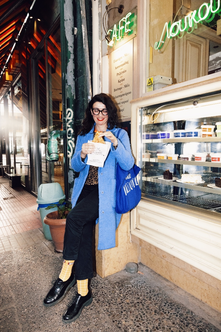 Τη συναντάμε στη Στάνη, στο διάλειμμά της από το γραφείο. Έρχεται εδώ τουλάχιστον μία φορά την εβδομάδα, για πάστα ποντικάκι ή τυρόπιτα κουρού. Τα κουλουράκια βουτύρου είναι το μόνιμο κέρασμα για τον πρωινό καφέ στο γραφείο. Το στυλ της μοιάζει με την Ομόνοια: απλό, αλλά με λεπτομέρειες που τραβούν το βλέμμα.