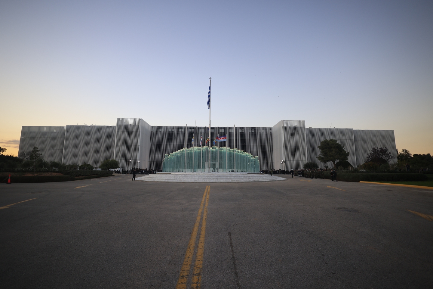 Ο διακεκριμένος για έργα δημόσιας γλυπτικής Βαρώτσος έχει παρομοιάσει τη νέα γιγαντιαία πρόσοψη, διαστάσεων 340 μ. μήκους και 30 μ, ύψους, με «μία μεμβράνη φτιαγμένη με κάθετους δοκούς από αλουμίνιο» – μια αρκετά διαδεδομένη πρακτική για τις προσόψεις στον βιοκλιματικό σχεδιασμό, αφού οι δοκοί λειτουργούν σαν να ήταν περσίδες, επιτρέποντας την καλύτερη δυνατή διαχείριση στο φως. Ταυτόχρονα, από καλλιτεχνική και αισθητική άποψη, η επιβλητική αλλά και «αέρινη» αυτή όψη σχεδιάστηκε όχι ανεξάρτητα, αλλά σε συνάρτηση με τις κατακόρυφες γυάλινες στήλες (μνημείο Κιβωτός Εθνικής Μνήμης) όπως και τους δύο –μνημειακής σημασίας– ελαιώνες που έχουν εγκατασταθεί από την άνοιξη στον περιβάλλοντα χώρο, ως μια ενιαία σύλληψη από τον Κώστα Βαρώτσο.