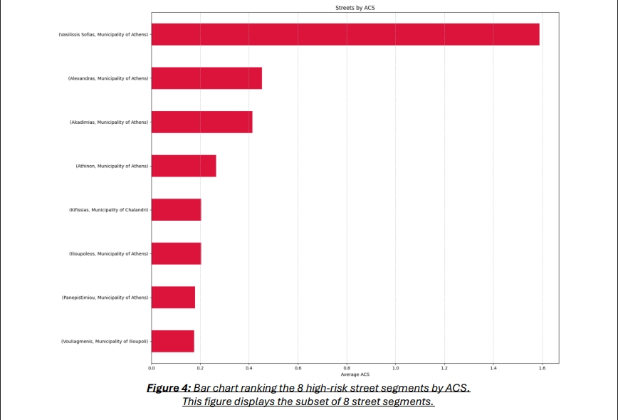 Από τον συνδυασμό των παραπάνω προκύπτει το Adjusted Crash Score (ACS) – ένας σύνθετος και πιο αντιπροσωπευτικός δείκτης για το πόσο επικίνδυνος είναι τελικά ένας δρόμος. Με βάση λοιπόν το ACS, οι ερευνητές εντόπισα συνολικά στο Λεκανοπέδιο 20 σημεία δρόμων υψηλού κινδύνου (σημειώνουμε: χαοτική η απόκλιση από τα 2.000 που απαριθμεί το Υπουργείο), ωστόσο πλήρη στοιχεία υπήρχαν διαθέσιμα μόνο για 8 σημεία από αυτά, και για τον λόγο αυτό η τελική ανάλυση περιορίστηκε στα συγκεκριμένα σημεία των κεντρικών λεωφόρων.