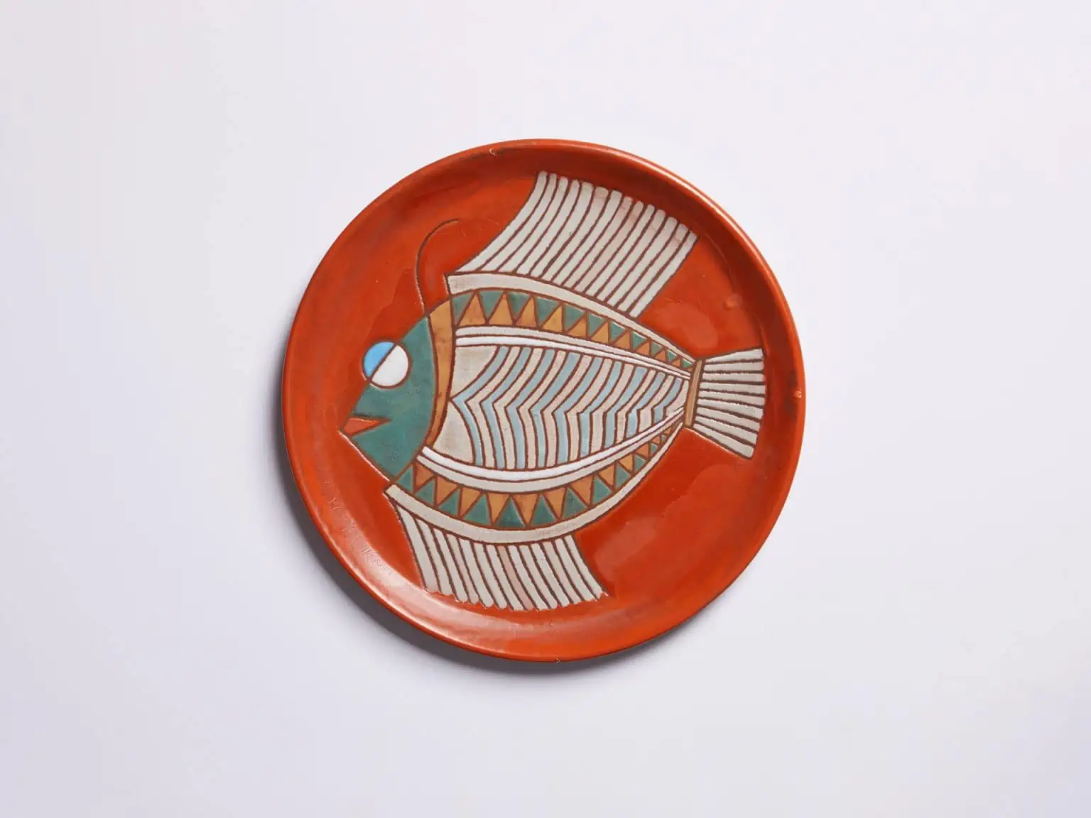 Ανάγλυφο, με υπέροχο πορφυρό φόντο και ένα καθαρό στις λεπτομέρειες ψάρι ως κεντρικό θέμα. Το συγκεκριμένο διακοσμητικό πιάτο από τα Κεραμικά Βαλσαμάκης (όπως και πολλά αντίστοιχα) που θα βρεις στο πωλητήριο του Μουσείο Κυκλαδικής αναβιώνουν την έντεχνη κεραμική που αναπτύχθηκε στην Ελλάδα κατά τις δεκαετία ’50-’60, στο πλαίσιο μιας πρωτοποριακής προσπάθειας να γεφυρωθεί η λαϊκή παράδοση με τον μοντερνισμό.