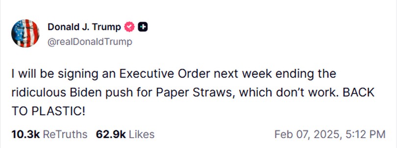 «ΠΙΣΩ ΣΤΟ ΠΛΑΣΤΙΚΟ!», έγραψε σε μία από τις αναρτήσεις του, στο δίκτυό του Truth Social, υπογράφοντας εκτελεστικό διάταγμα που έδωσε τέλος «στη γελοία προώθηση στα χάρτινα καλαμάκια πόσης», μία πρωτοβουλία του προκατόχου του, Joe Biden.