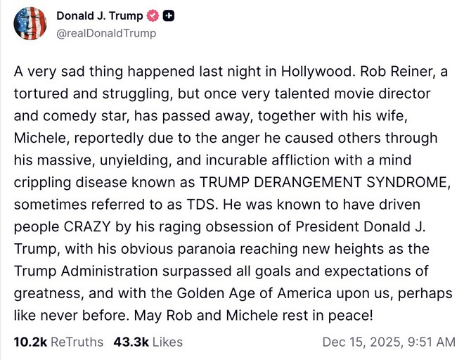 Ενώ μεγάλο μέρος του κόσμου ένωσε τις φωνές του για να θρηνήσει τον θρύλο του Χόλιγουντ Rob Reiner μετά την είδηση της δολοφονίας του ίδιου και της συζύγου του Michele, στα μέσα Δεκεμβρίου, ο Trump το είδε ως ευκαιρία να χλευάσει τον εκλιπόντα σκηνοθέτη και ηθοποιό. Σε ένα ρεσιτάλ χυδαιότητας μάλιστα, ανακοίνωσε και την «αιτία» θανάτου του.