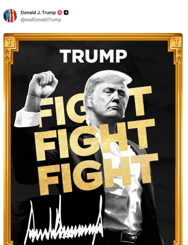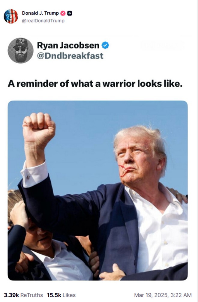 Φυσικά, ένα από τα αγαπημένα χόμπι του Trump είναι να αναδημοσιεύει επαίνους για τον εαυτό του. Όπως το screenshot μιας ανάρτησης στο X ενός χρήση με το όνομα Dndbreakfast, που έγραφε: «Μια υπενθύμιση για το πώς μοιάζει ένας πολεμιστής» πάνω από μια φωτογραφία του Trump μετά την απόπειρα δολοφονίας του.