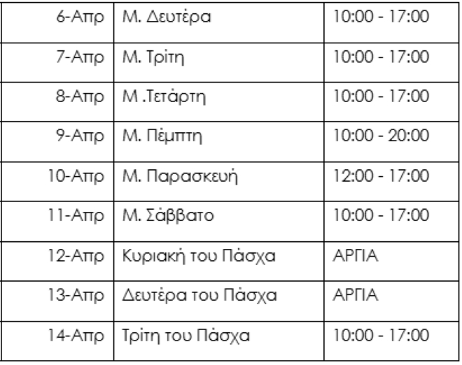 Εορταστικό Ωράριο Πάσχα
