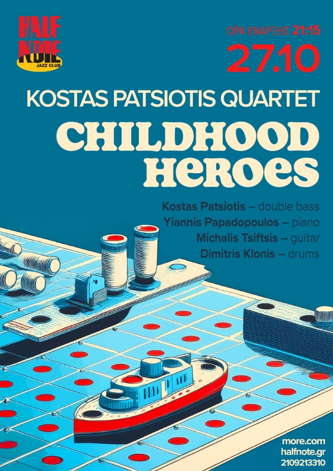 Ο διακεκριμένος κοντραμπασίστας και συνθέτης Κώστας Πατσιώτης επιστρέφοντας από τις εμφανίσεις του στην Ινδονησία και τη συμμετοχή του σε διεθνές jazz festival, παρουσιάζει με το κουαρτέτο του στη σκηνή του Half Note Jazz Club, τη Δευτέρα 27 Οκτωβρίου 2025,το νέο του άλμπουμ με τίτλο “Childhood Heroes”.
