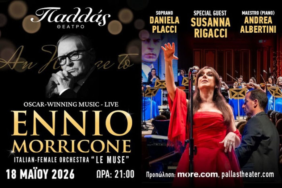 Οι θρυλικές μελωδίες του Ennio Morricone ζωντανεύουν σε μια μοναδική συναυλία στο Θέατρο Παλλάς τη Δευτέρα 18 Μαΐου 2026, με πρωταγωνίστρια τη γυναίκα που ταυτίστηκε όσο καμία άλλη με τη μουσική του μεγάλου Ιταλού συνθέτη: τη σοπράνο Susanna Rigacci, τη φωνή που επέλεξε ο ίδιος ο Morricone και που τον συνόδευε στις παγκόσμιες συναυλίες του για περισσότερα από είκοσι χρόνια. Η θρυλική σοπράνο εμφανίζεται μαζί με τη διεθνώς αναγνωρισμένη Italian Female Orchestra LE MUSE, το ιταλικό ensemble που ειδικεύεται στις συνθέσεις του Morricone. Ενα μοναδικό μουσικό αφιέρωμα.