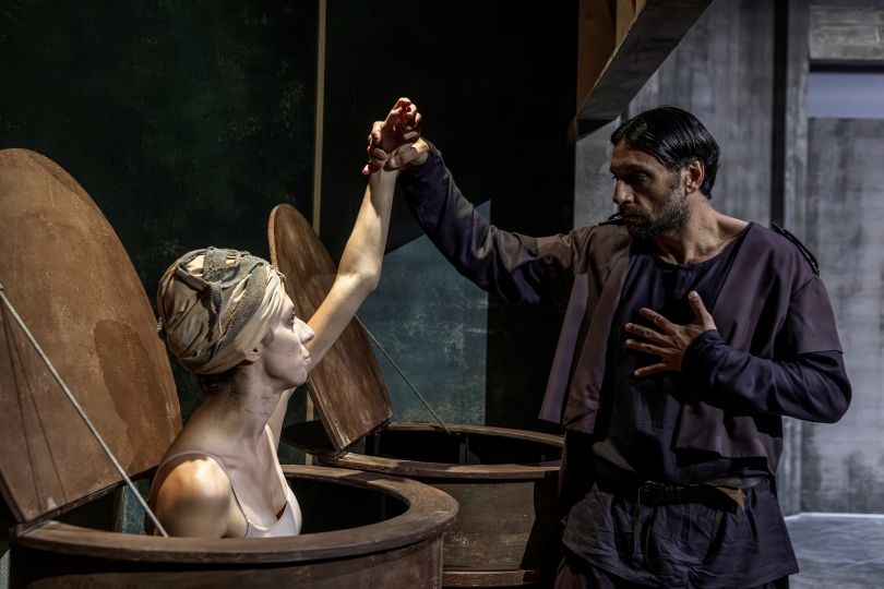 Το εντυπωσιακό σκηνικό μας μεταφέρει σε ένα καταφύγιο, μετά το τέλος του κόσμου. Ένα παιχνίδι φτάνει στο τέλος του… ή μήπως το τελευταίο κομμάτι μιας παρτίδας που ξαναρχίζει; Η σκηνοθετική προσέγγιση του Μάκη Παπαδημητρίου εστιάζει στον βαθιά ανθρώπινο πυρήνα του έργου: τέσσερις χαρακτήρες σε έναν ερειπωμένο κόσμο, που προσπαθούν να γεφυρώσουν τις αποστάσεις με λέξεις, βλέμματα, σιωπές. Σιωπές, οι οποίες – όπως όρισε ο ίδιος ο Beckett – τηρούνται ευλαβικά, όχι από τυπολατρία, αλλά γιατί μέσα τους κρύβονται όλα τα αναπάντητα ερωτήματα της ύπαρξης.