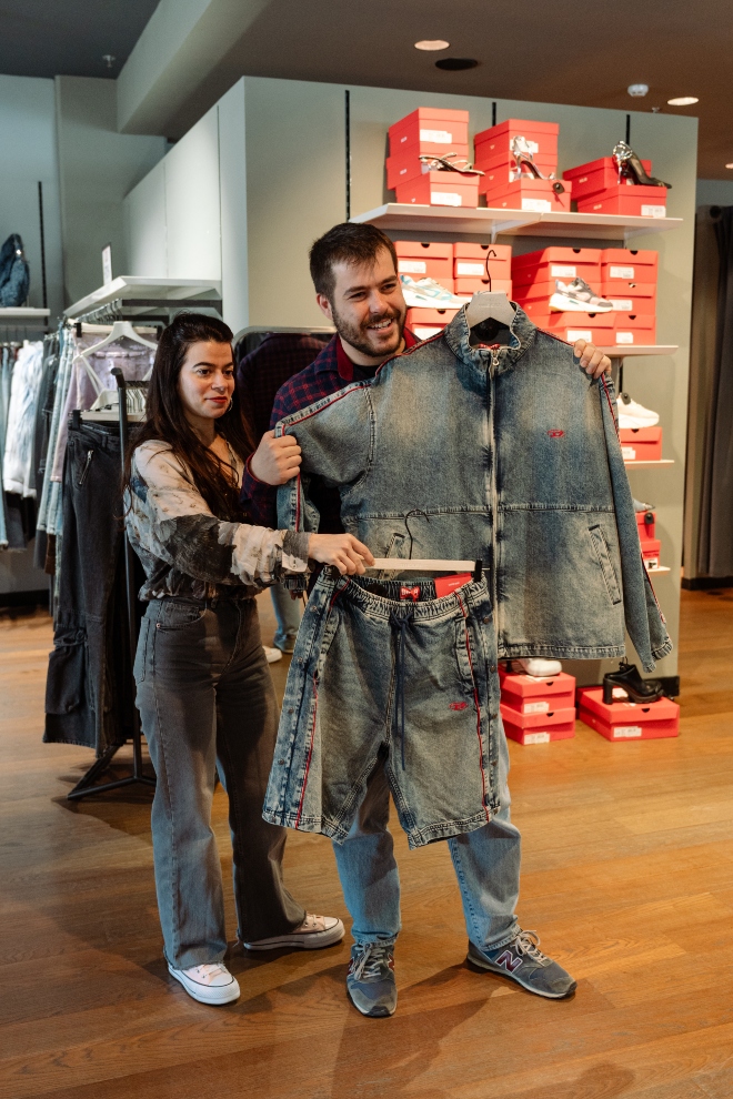 Και μετά τα υφασμάτινα στρατιωτικά παντελόνια, σειρά είχαν τα jeans. Επομένως, η στάση στο κατάστημα της Diesel ήταν μονόδρομος. Πρότεινα στον Άγγελο μία βερμούδα αντί για παντελόνι, μιας και το καλοκαίρι είναι μπροστά μας και εκείνος βρήκε το πιο stylish σχέδιο: μία μακριά βερμούδα με λάστιχο και το αντίστοιχο τζάκετ της.