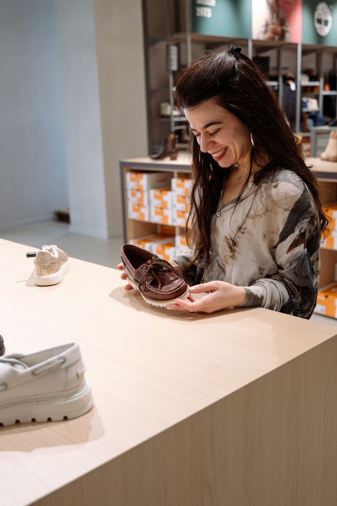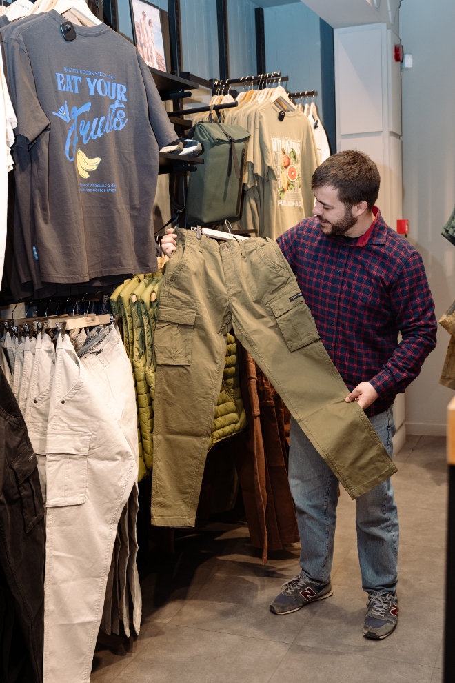 Το κατάστημα της Timberland ήταν η πρώτη μας στάση, μιας και ο Άγγελος μου είπε ότι πρέπει οπωσδήποτε να ανανεώσει τα πουκάμισα που κρέμονται στην ντουλάπα του. Τα βαμβακερά καρό σε διαχρονικούς χρωματικούς συνδυασμούς ήταν ό,τι ακριβώς έψαχνε.