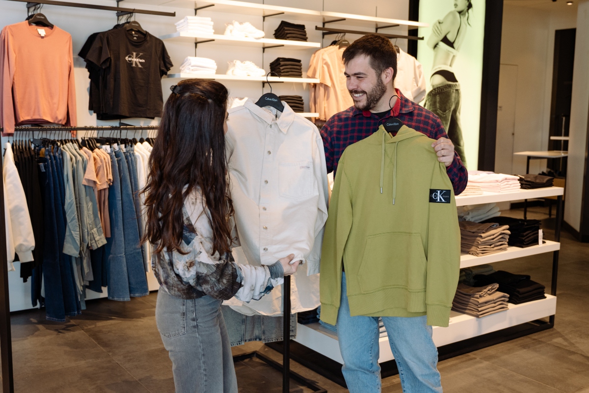Επόμενη στάση το κατάστημα της Calvin Klein. Ο Άγγελος επέλεξε ένα hoodie σε χακί απόχρωση -και ένα baseball cap σε αντίστοιχο χρώμα- και εγώ ένα λευκό τζην overshirt αντί για το κλασικό τζην μπουφάν.