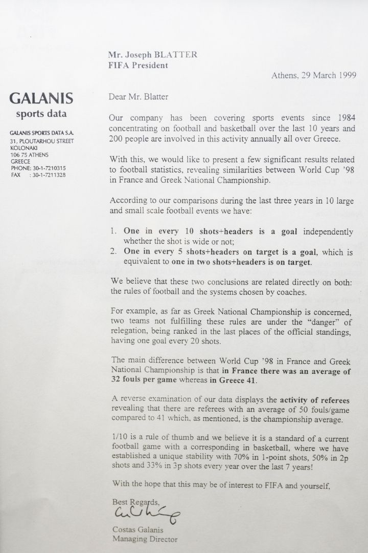 Πίσω σου έχω μια επιστολή που είχα στείλει στον Sepp Blatter, πρόεδρος της FIFA τότε, βαρύ όνομα πολύ. Του έγραψα ότι έχω παρατηρήσει πως ένα στα δέκα σουτ καταλήγει στα δίχτυα και ότι ένα στα δύο καταλήγουν εστία. Επικοινώνησε αμέσως. Ο πρόεδρος της FIFA. Μου είπε ότι μας ενδιαφέρουν τα στατιστικά, θέλουμε να μείνουμε σε επαφή.